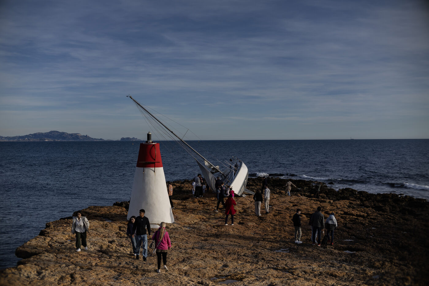 Un voilier échoué sur les rochers du littoral à Carry-le-Rouet après le passage de la tempête Nils.