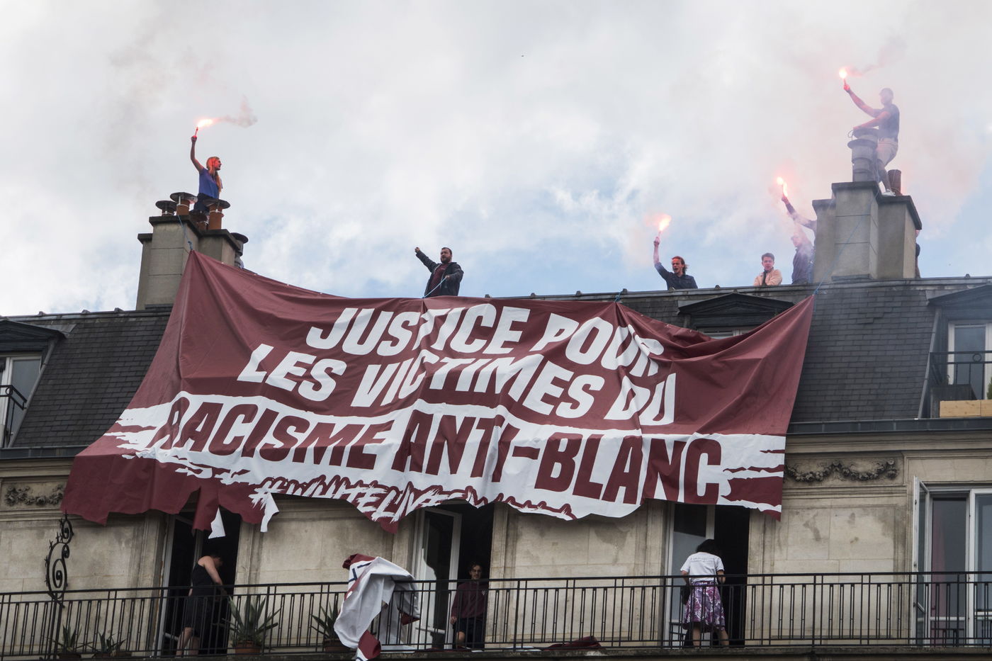 Several ultra-rightwing agitators climb the roof of a building with a 'White Lives Matter' banner with the words anti-white racism during a massive demonstration in memory of Adama Traoré and George Floyd. Black Saturday at Place de la Republique, Paris. While the United States tears apart the same week of George Floyd's funeral. At least 20,000 people defied the ban on demonstrations and responded to the collective call "Truth for Adama Traore".