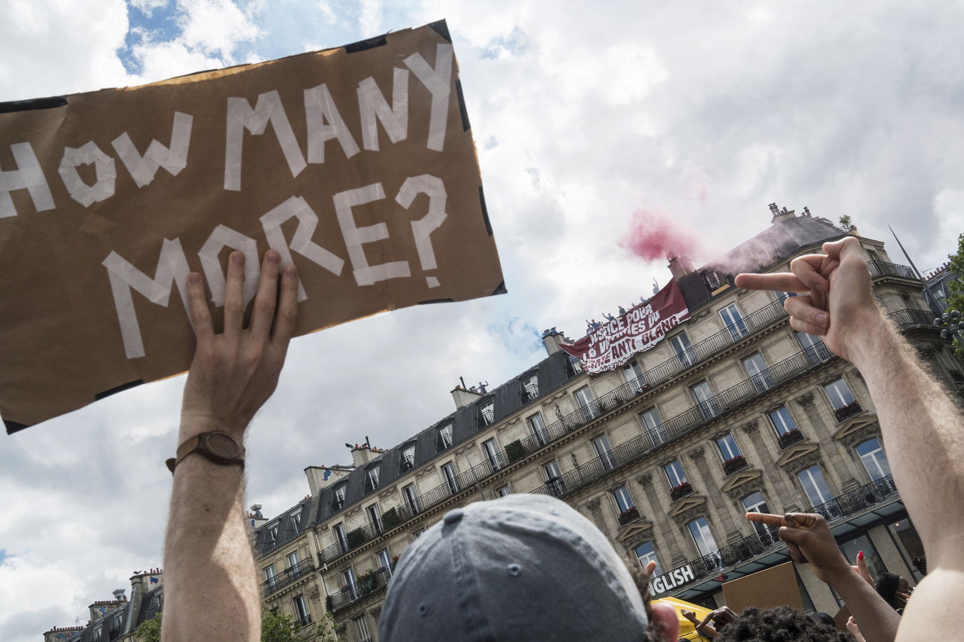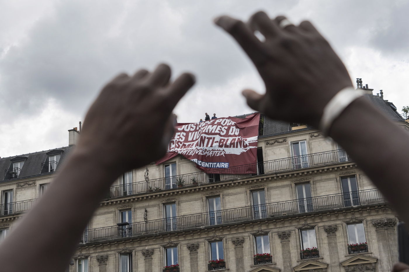 Provocation droitiste contre manifestation d'Adama Traoré à Paris. Plusieurs droitistes monte le toit d'un batiment avec une banniere 'White Lives Matter' avec les mots anti-racisme anti-blanc pendant une manifestation massive en mémoire d'Adama Traoré et George Floyd. Black Saturday à Place de la Republique, Paris. Alors que les Etats-Unis se déchirent la meme semaine d'enterrement de George Floyd. Au moins 20 000 personnes ont bravé l'interdiction de manifester et répondu à l'appel du collectif «Vérité pour Adama Traoré».