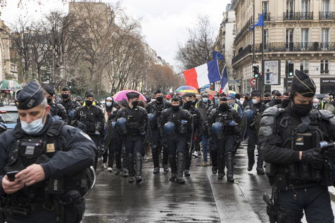 Thousands of demonstrators across France gathered for the United Freedom March to protest against Article 24 of the Global Security laws, which bans publication of images identifying French police officers. Journalists and rights organisations have criticised the new law. Heavy police presence at demonstration.