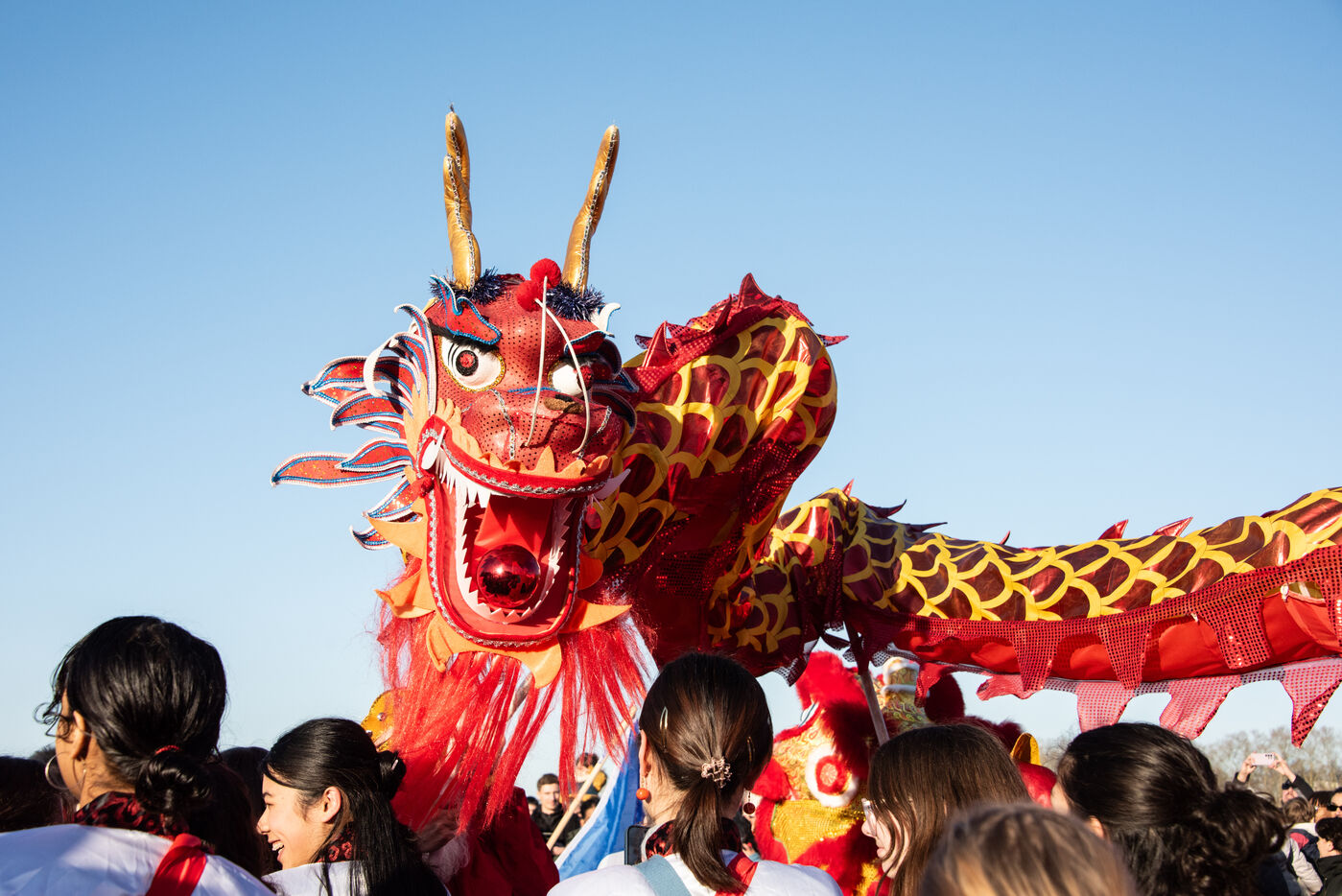 Parti de la place de la Victoire, il s'est terminé par un rassemblement au Miroir d’eau pour la traditionnelle danse de lions et de dragons. Une foule nombreuse s'était réunie pour l'occasion, sous le soleil hivernal de la fin d'après-midi.
