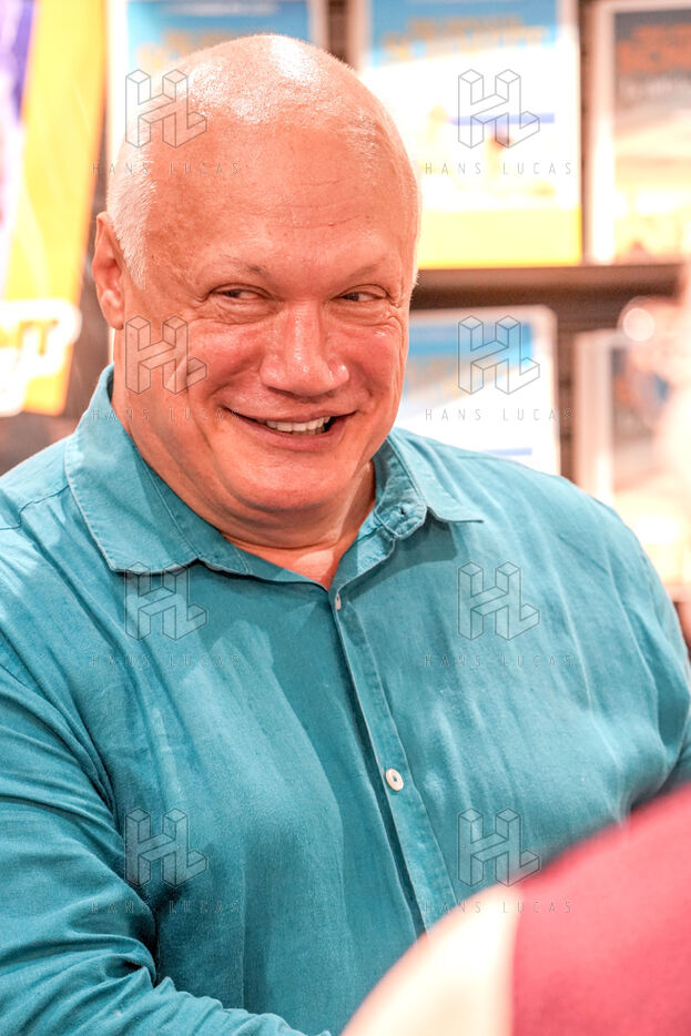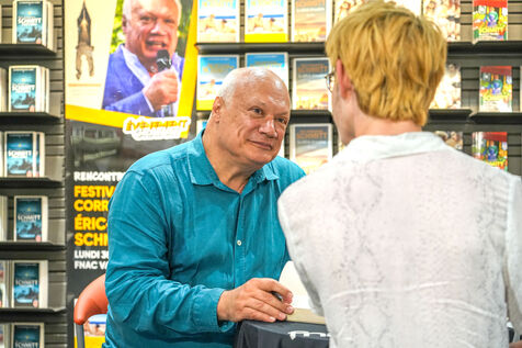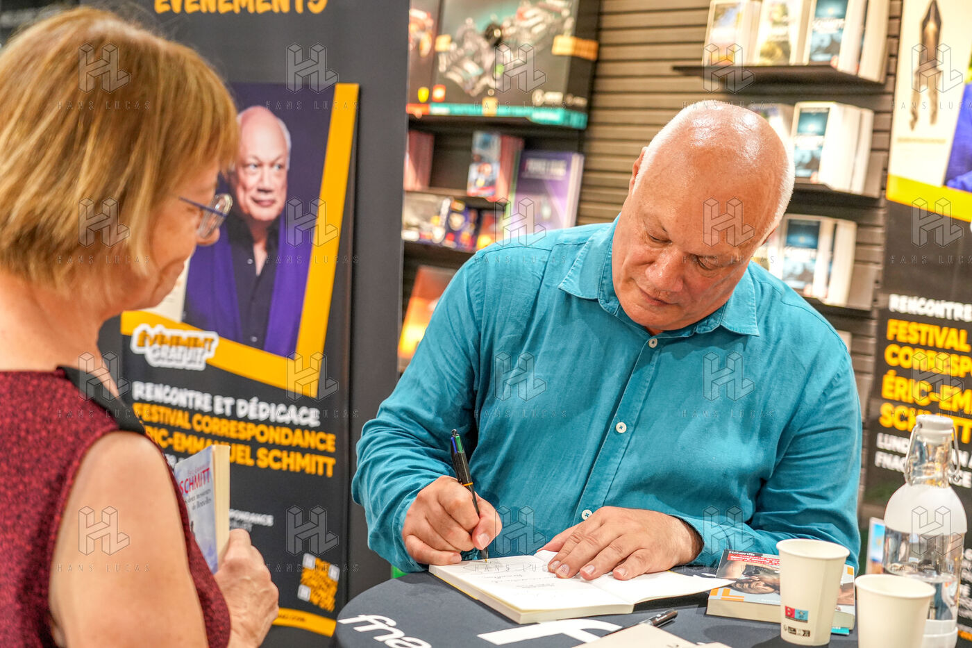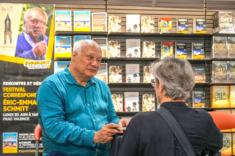 The writer Eric Emmanuel SCHMITT gives a conference in front of around fifteen readers and fans in the FNAC store in Valence, then he signs his books and chats with his audience.