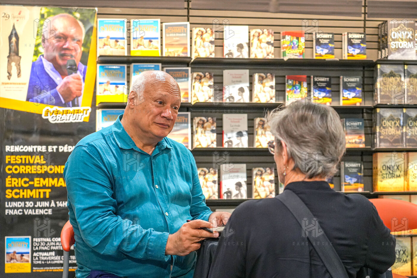 L'écrivain Eric Emmanuel SCHMITT donne une conférence devant une quinzaine de lecteurs et fans dans le magasin FNAC à Valence, puis il dédicace ses livres et discute avec son public.