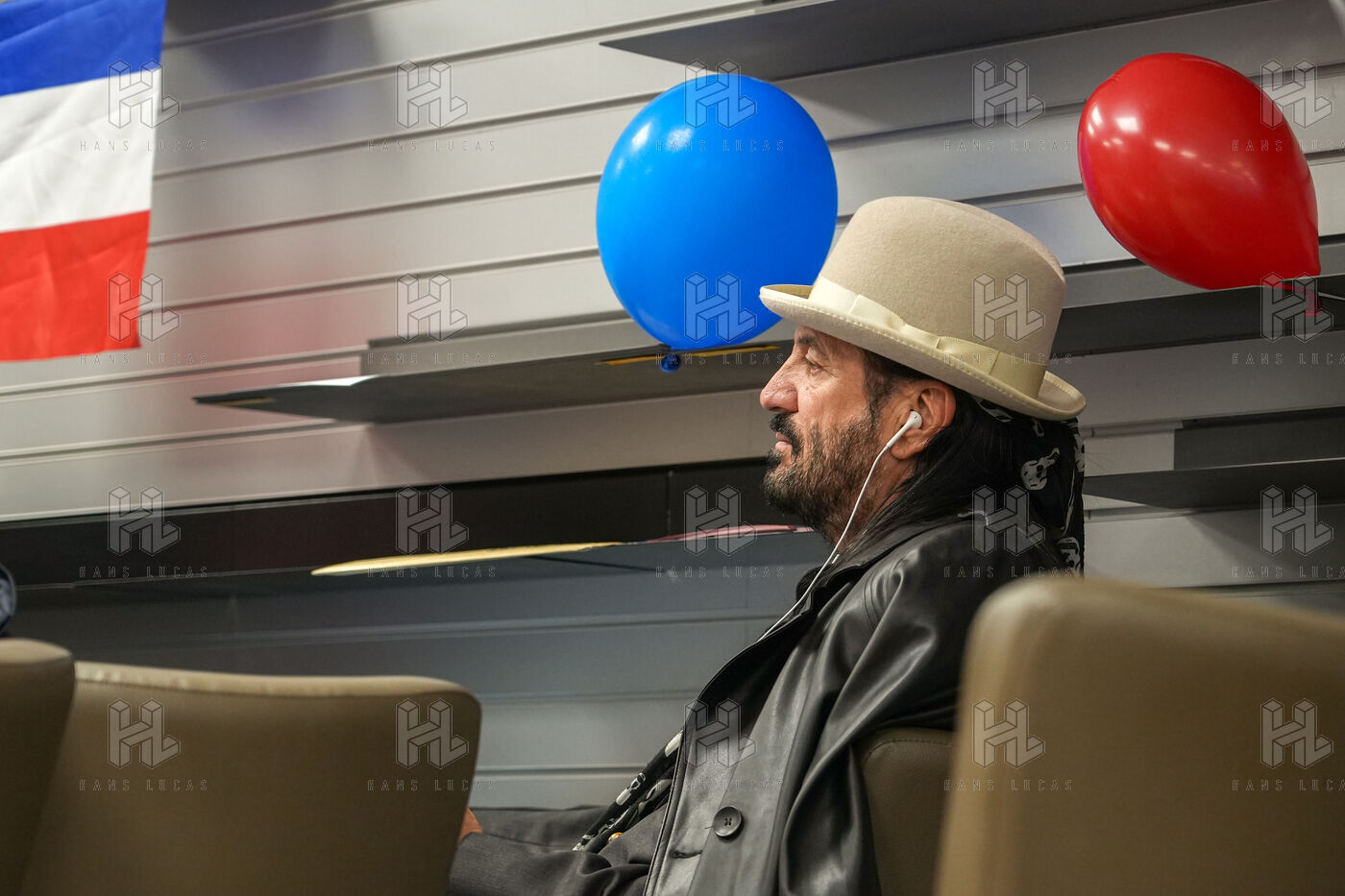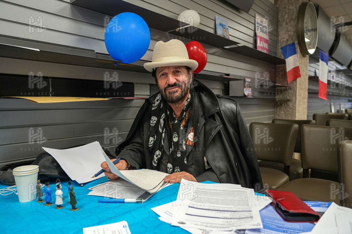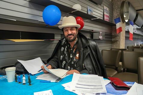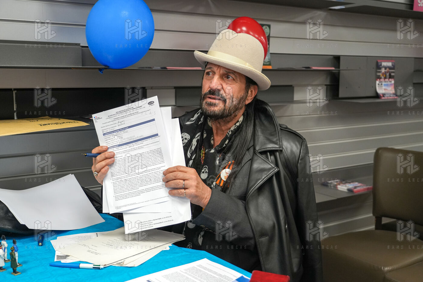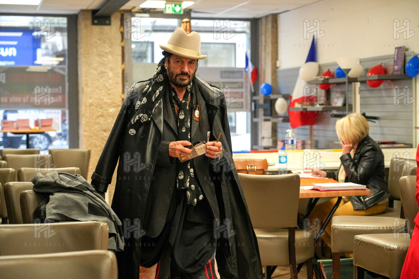 Portrait of singer Francis Lalanne, lead candidate in the 5th arrondissement of Lyon for the 2026 municipal elections, in the headquarters of the Spartacus political party, which positions itself as a citizen and sovereign alliance.