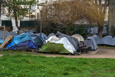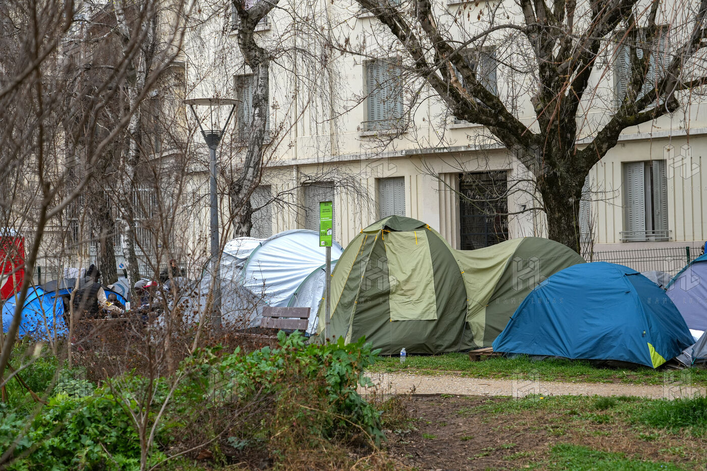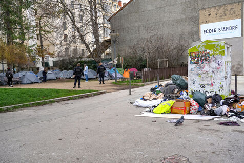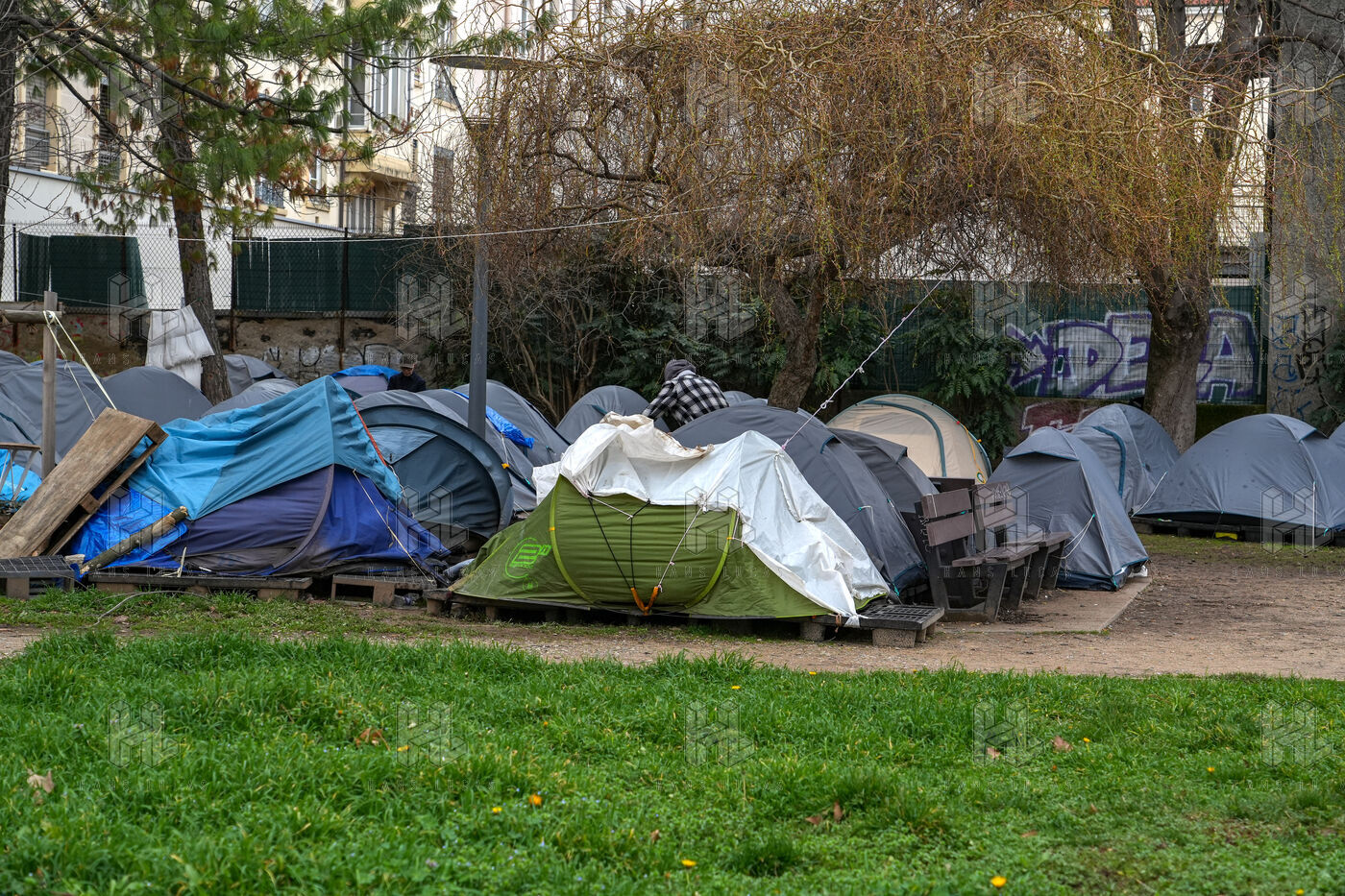 Un campement d'une centaine de tentes installées illégalement et occupées par des migrants, des sans papiers et des sans abri, sur le square Deperet