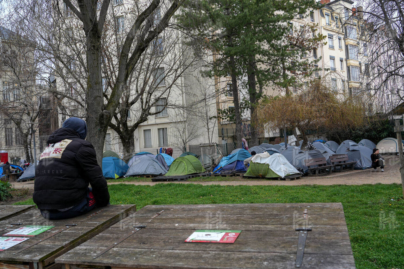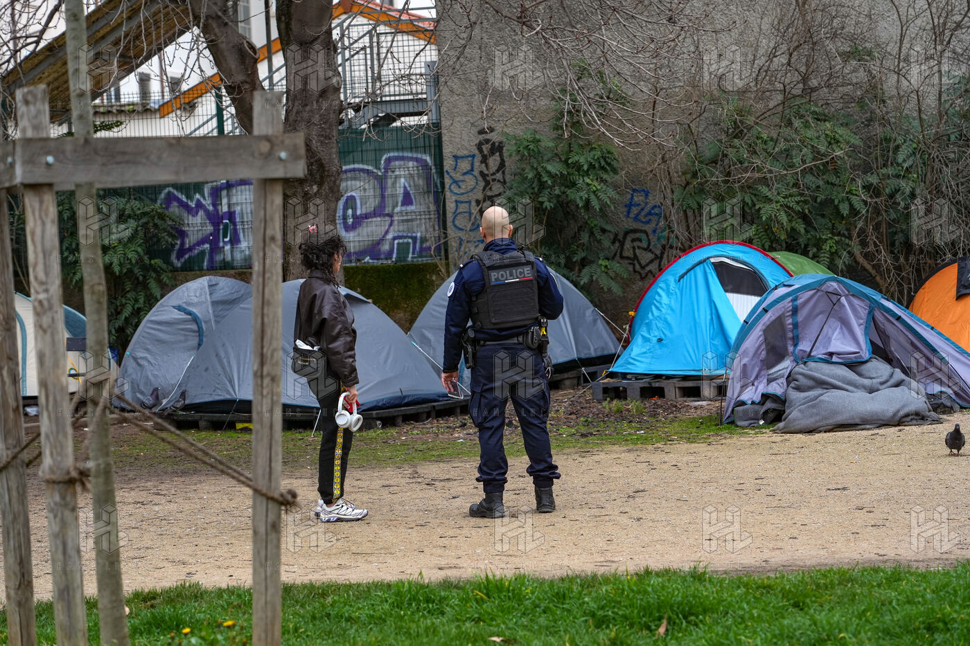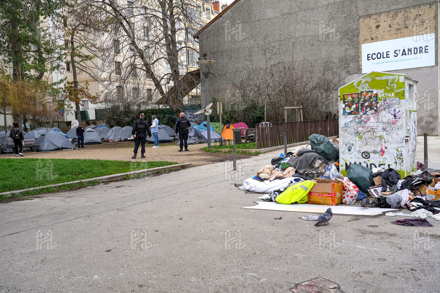 Un campement d'une centaine de tentes installées illégalement et occupées par des migrants, des sans papiers et des sans abri, sur le square Deperet