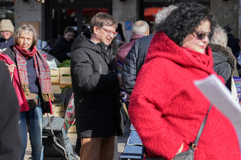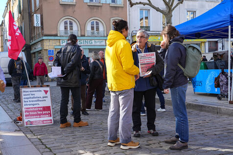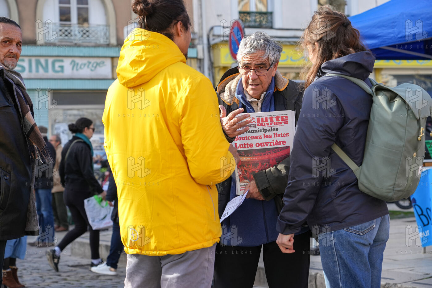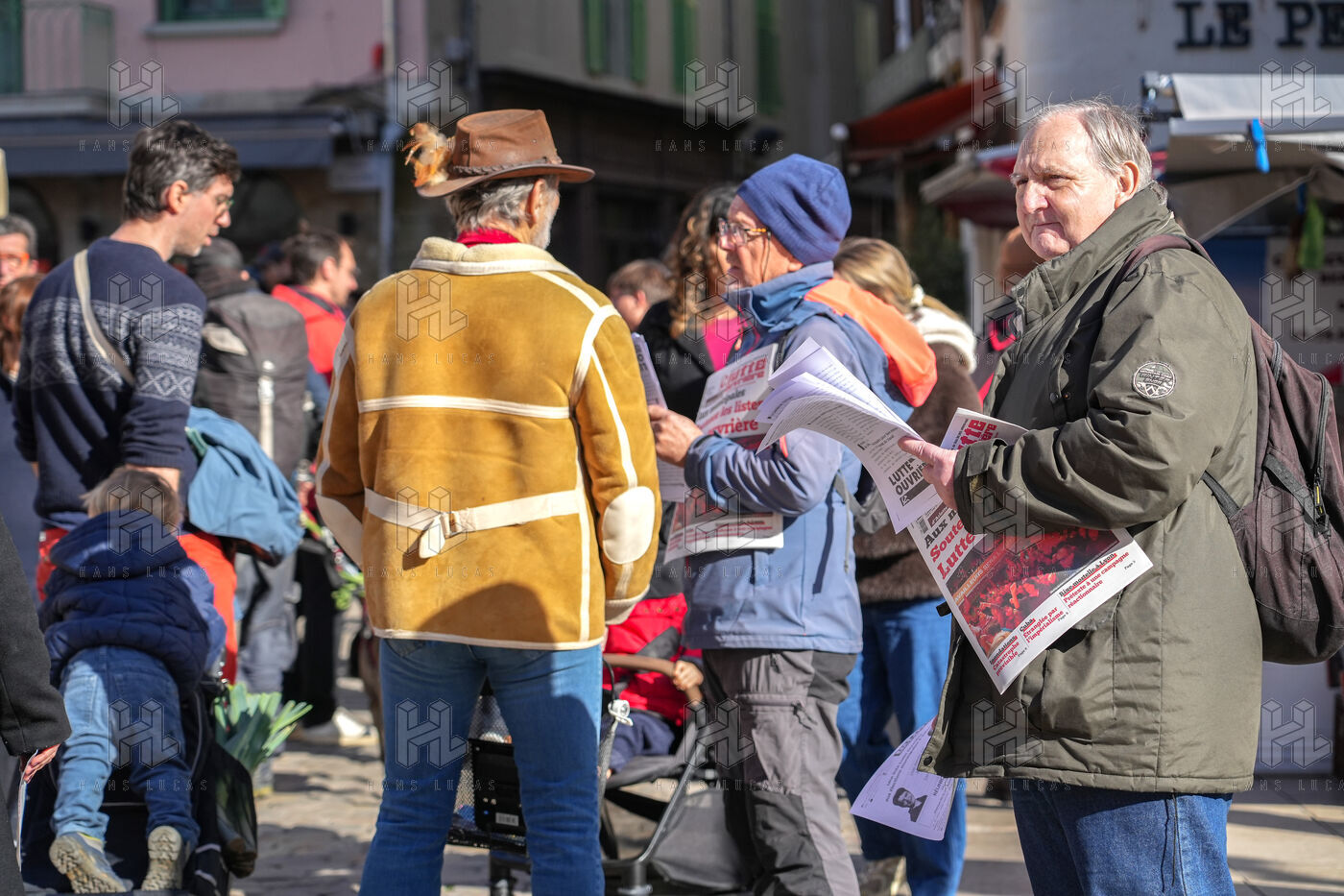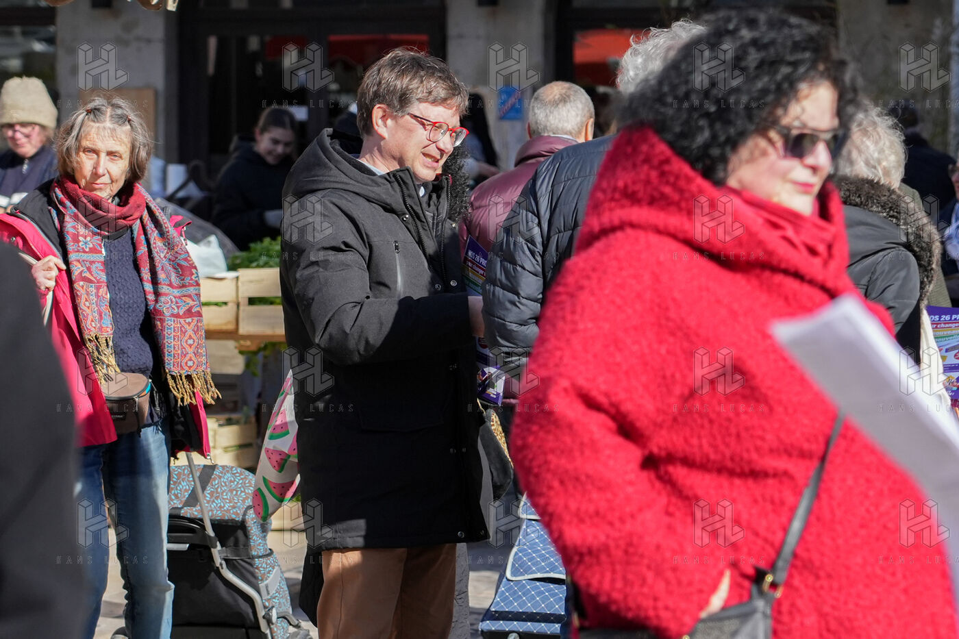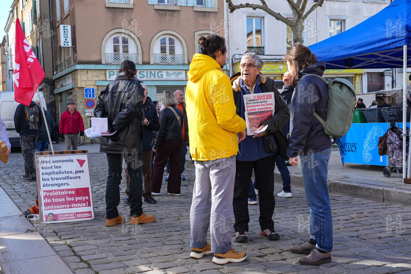 Several candidates for the municipal elections in Valence are mobilizing at the weekly market in the city center to distribute propaganda leaflets and to meet the population.