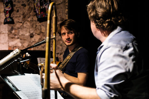 The duo Chet It Out, with the trombonist Dan Diruzza and the guitarist Cesar Jacquot at the Gazette Cafe (Montpellier), on January 6, 2023.