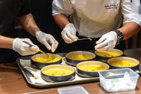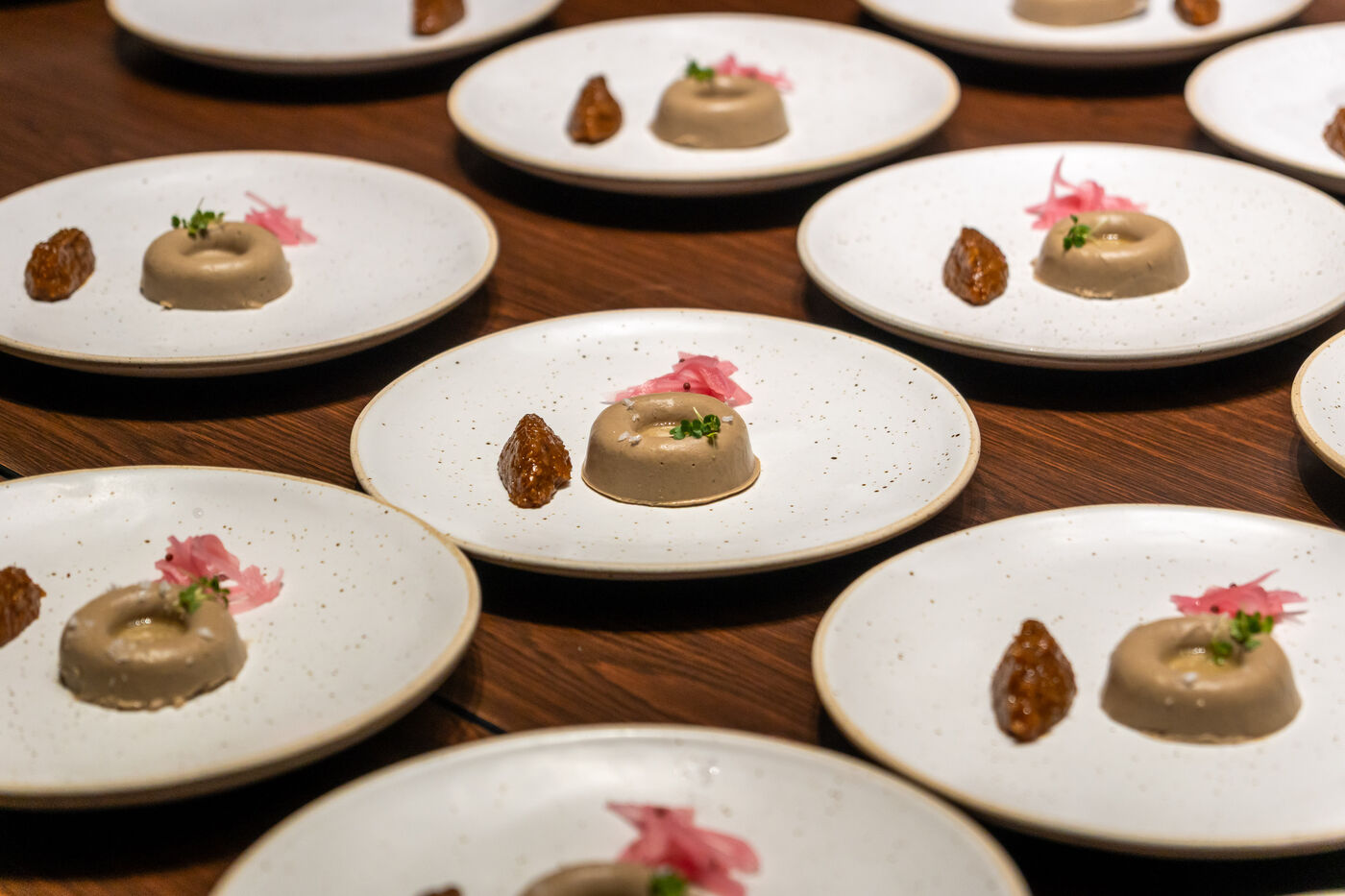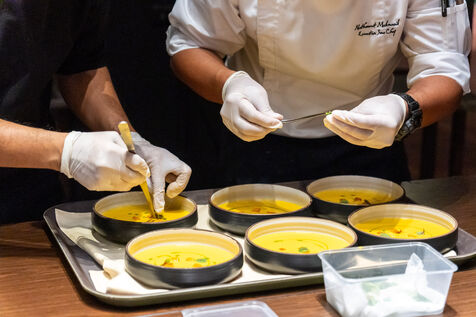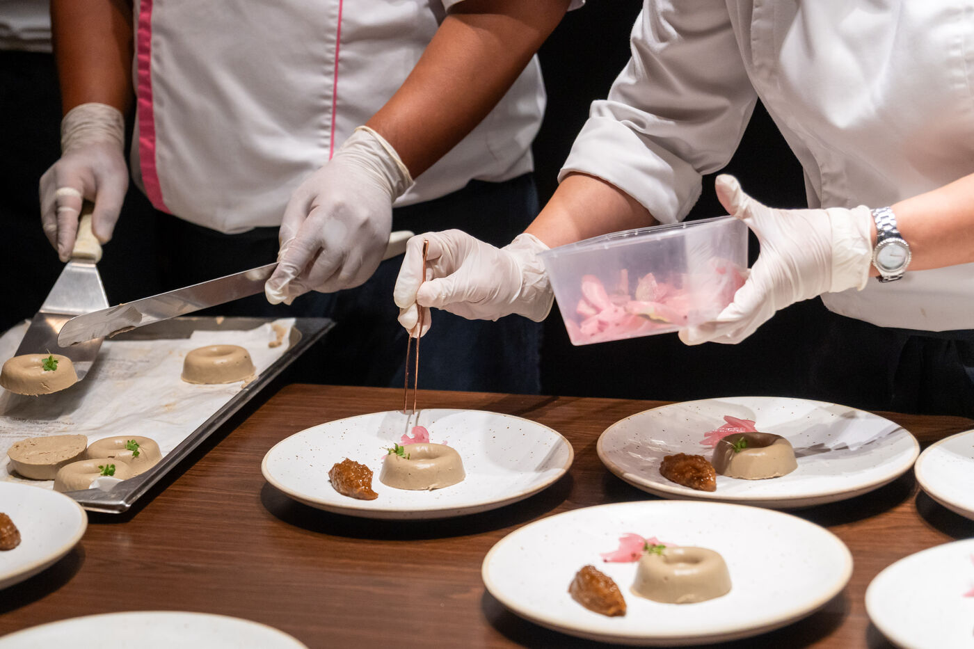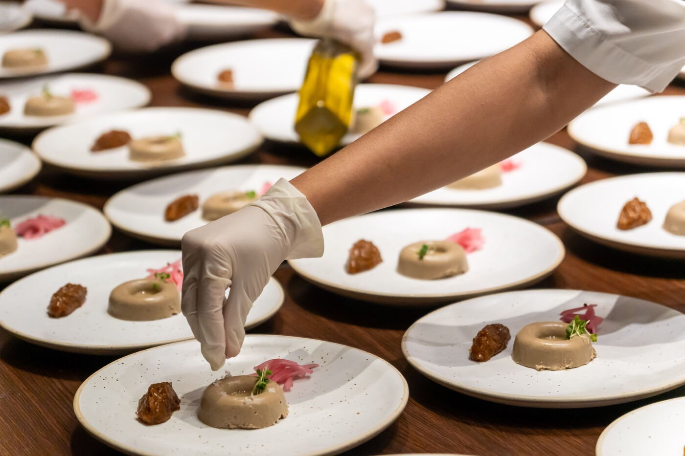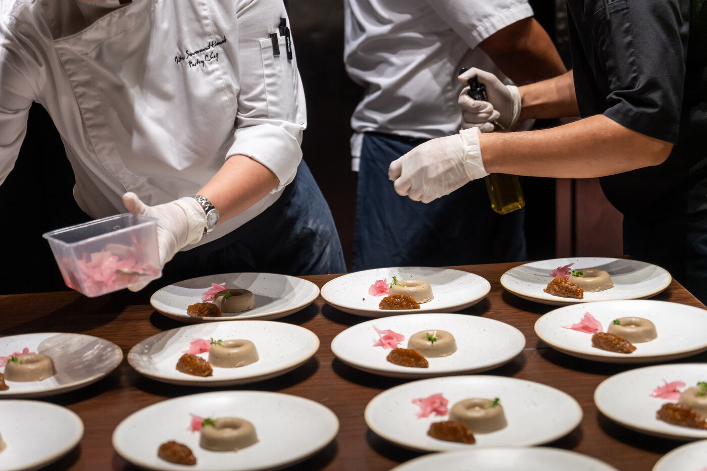 A behind-the-scenes look at the chef and his team as they meticulously craft and plate each dish, showcasing precision, teamwork, and culinary artistry right up to the final touches of a corporate gala dinner.