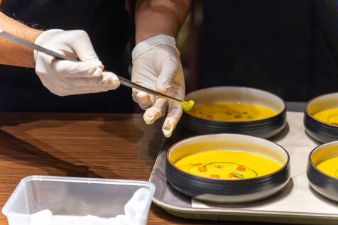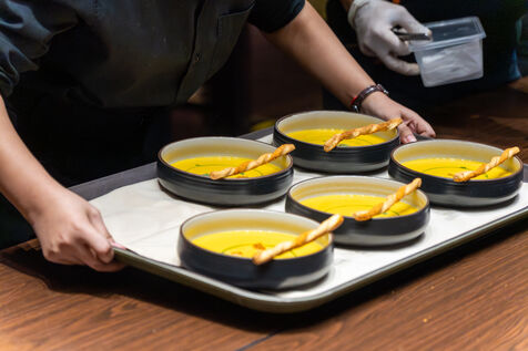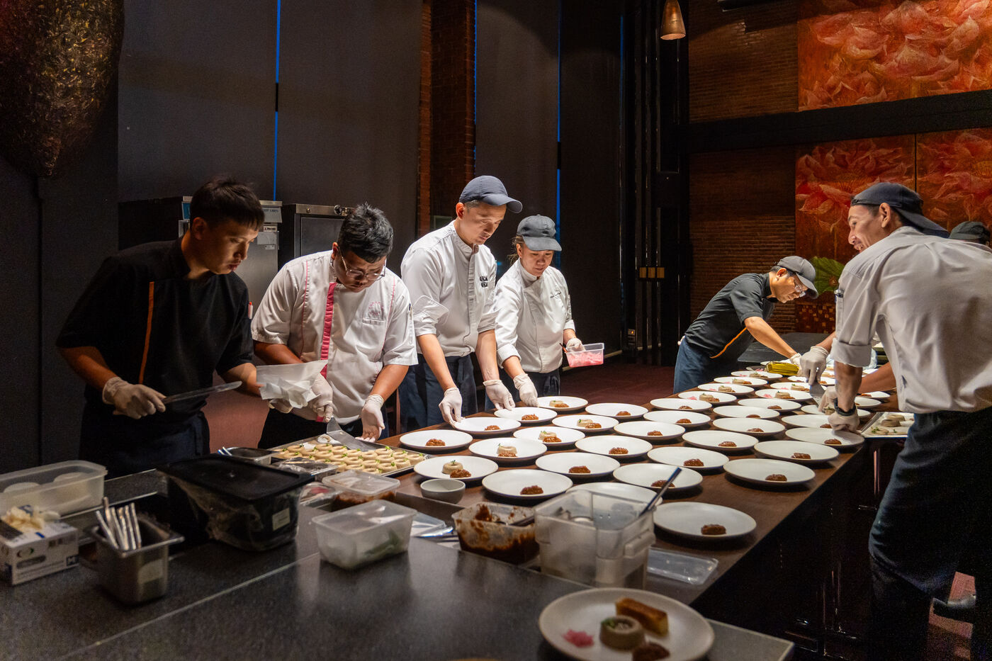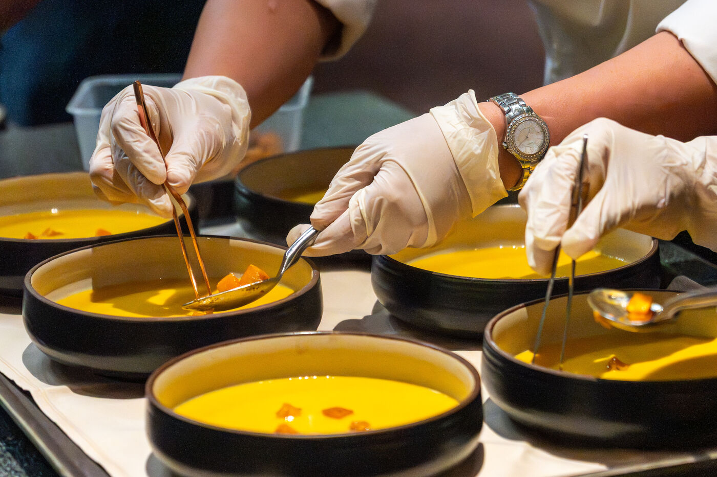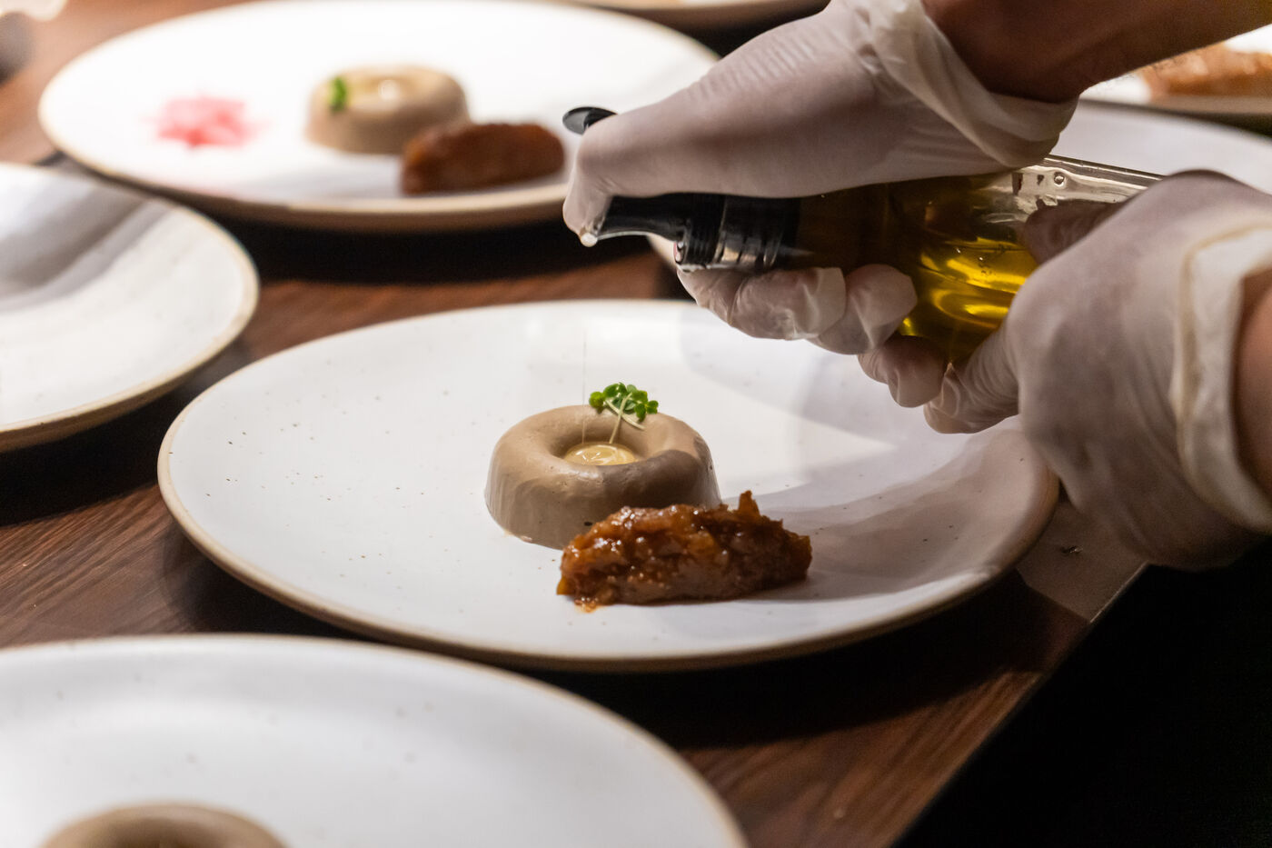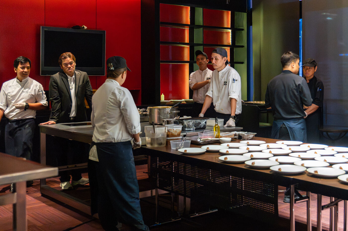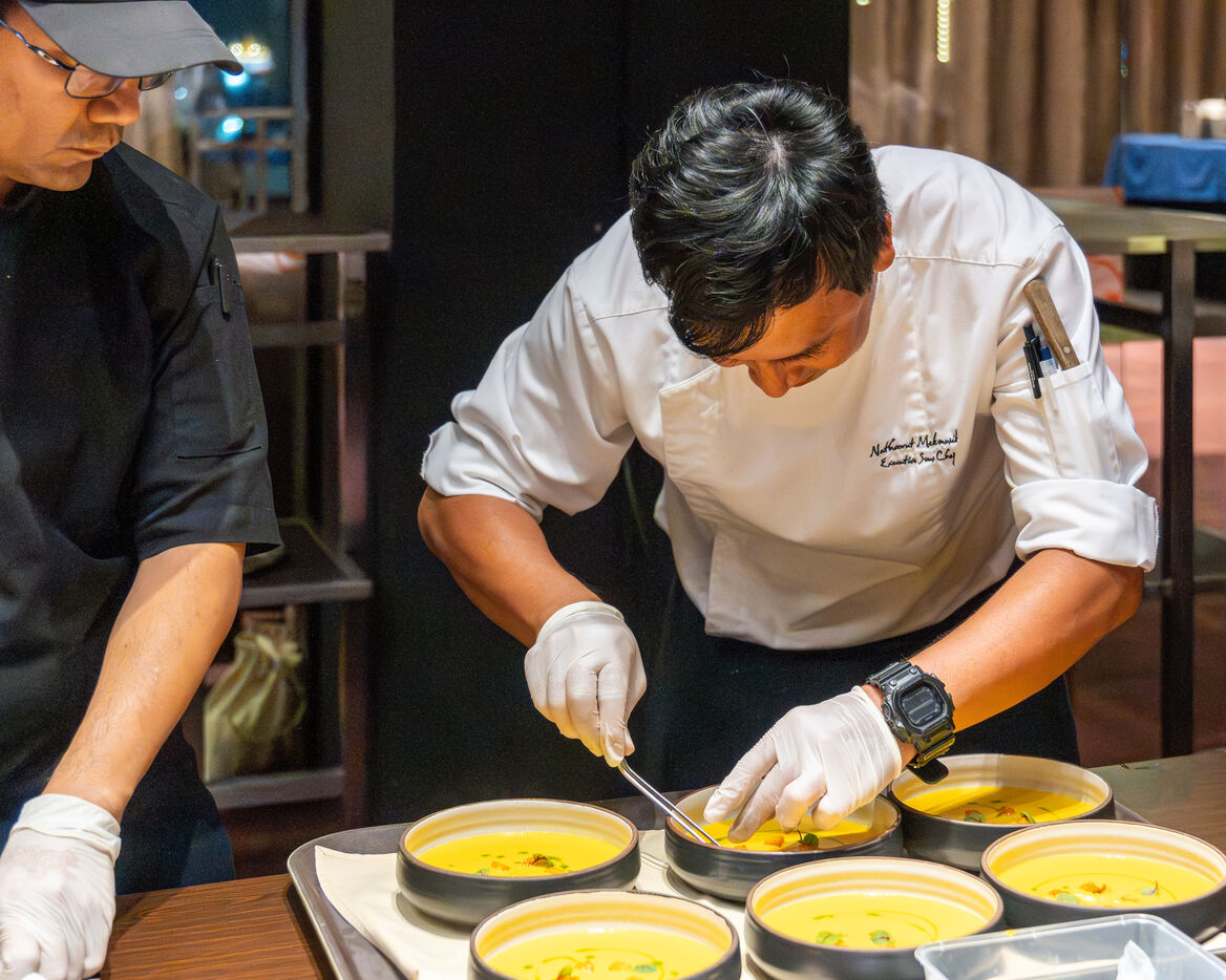 A behind-the-scenes look at the chef and his team as they meticulously craft and plate each dish, showcasing precision, teamwork, and culinary artistry right up to the final touches of a corporate gala dinner.