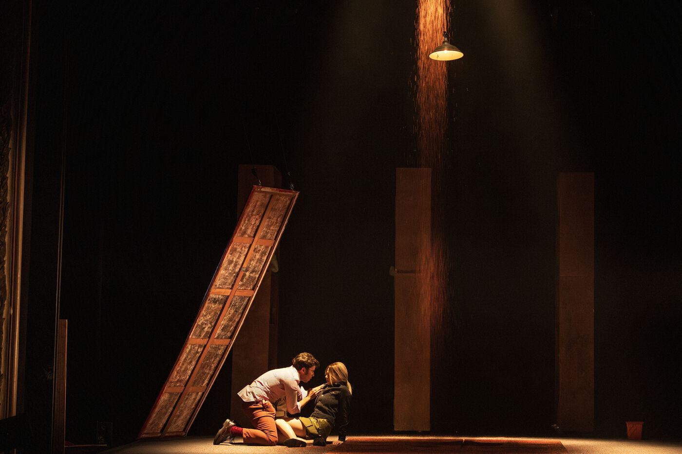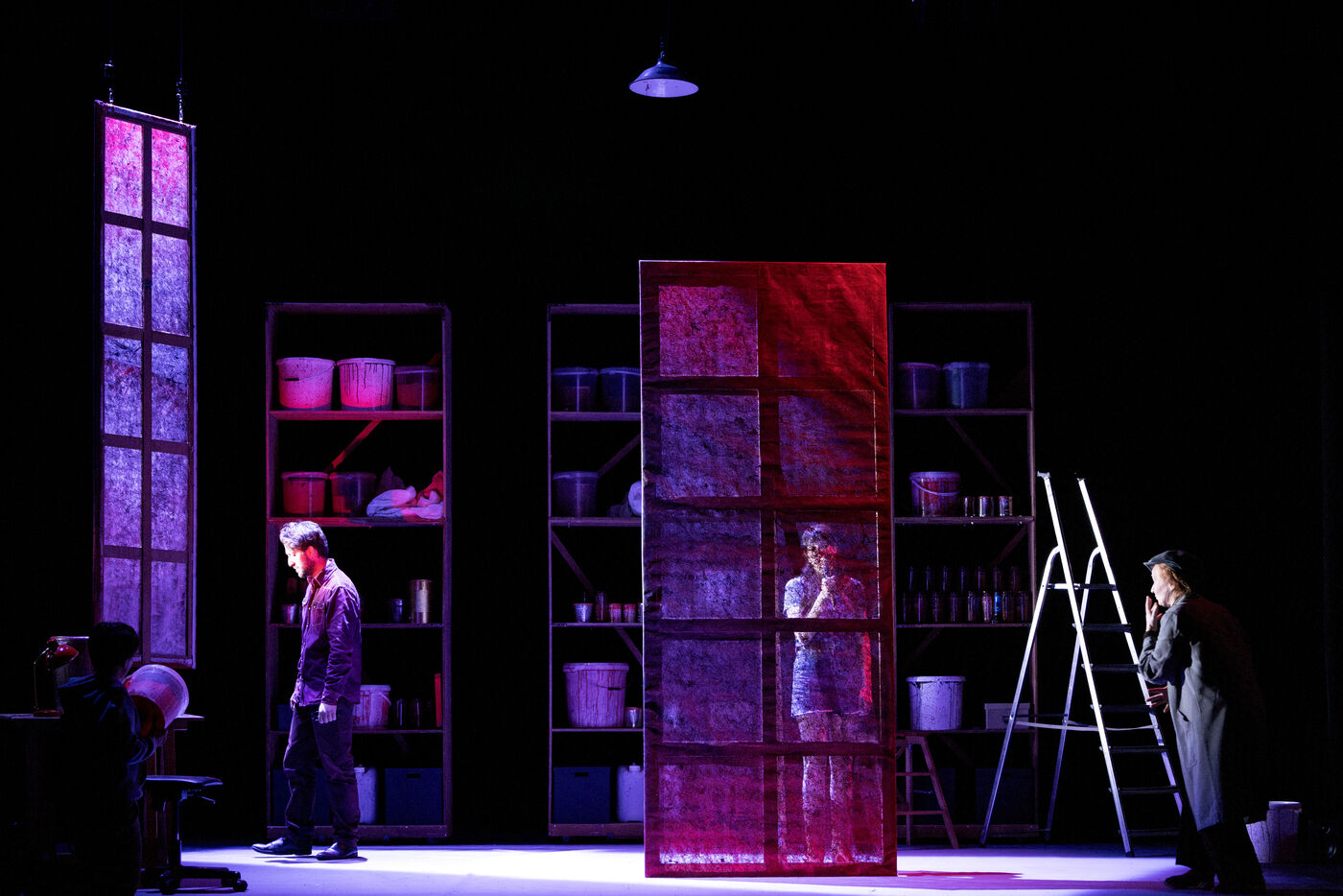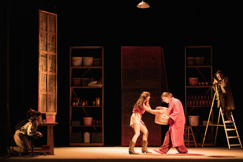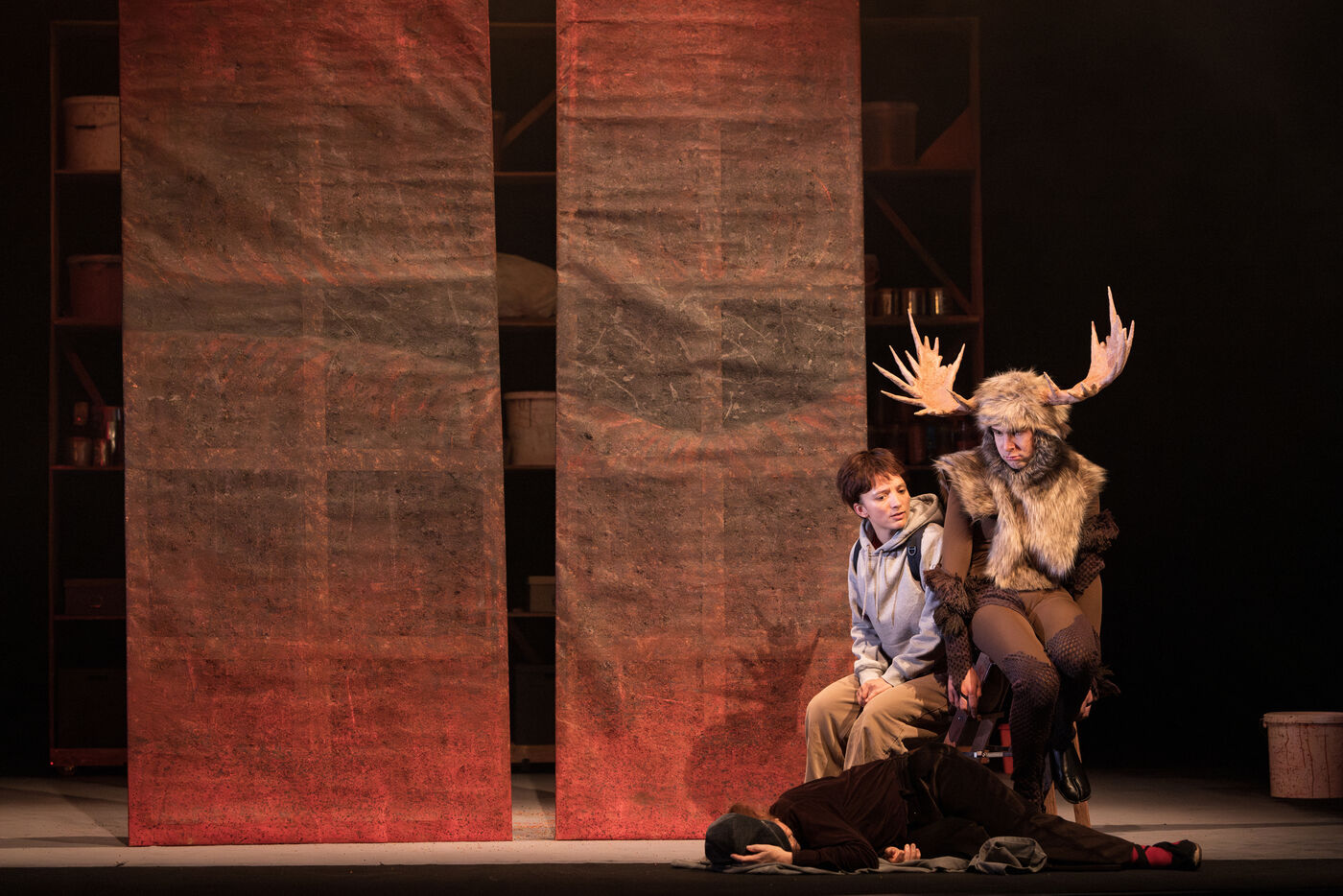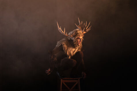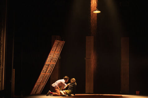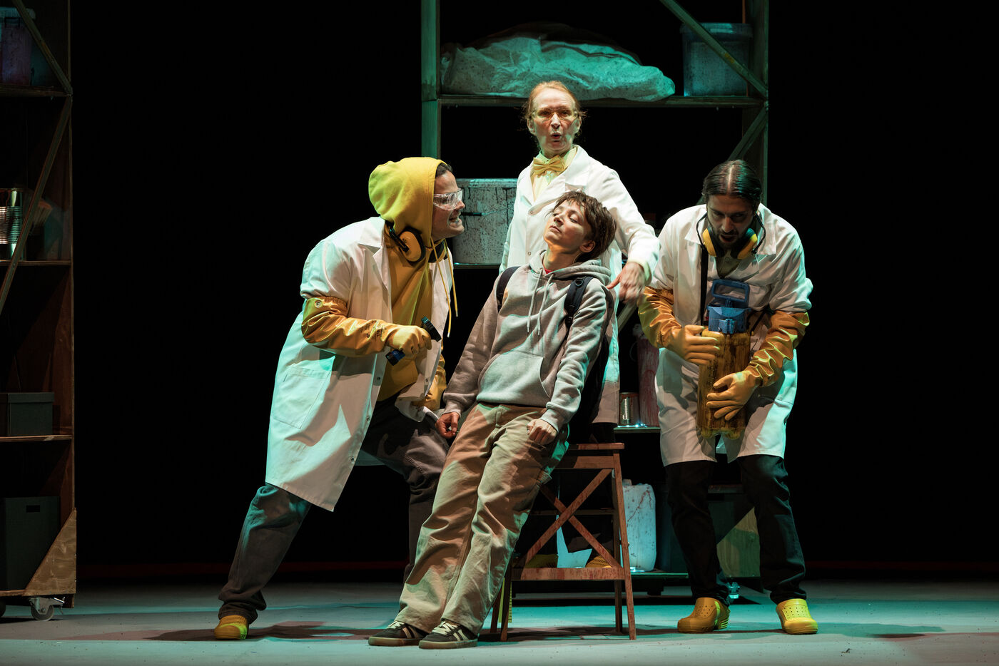 Sur la route d Eden / theatre creation. Written by La compagnie sans roi. Play and written by David Guez, directed by David Guez and Edouard Eftimakis. Set design and lighting: Manon Vergotte. Sound design: Mateo Esnault. Make-up: Tina Honic. Actors and actresses: Celine Cheenne, Hermine Dos Santos, Edouard Eftimakis, Alexandre Gonin, Thibaud Guillon-Marchi, David Guez, Paul Meynieux, Leila Muse, Candice Pauilhac. Premiered at the Theatre de Lisieux Normandie, France, on 6 May 2025. Photography by Nadege Le Lezec / Hans Lucas