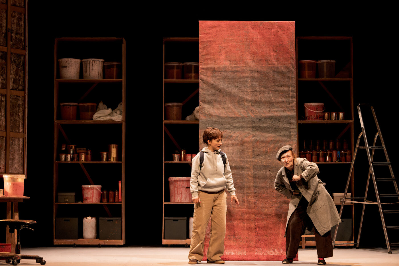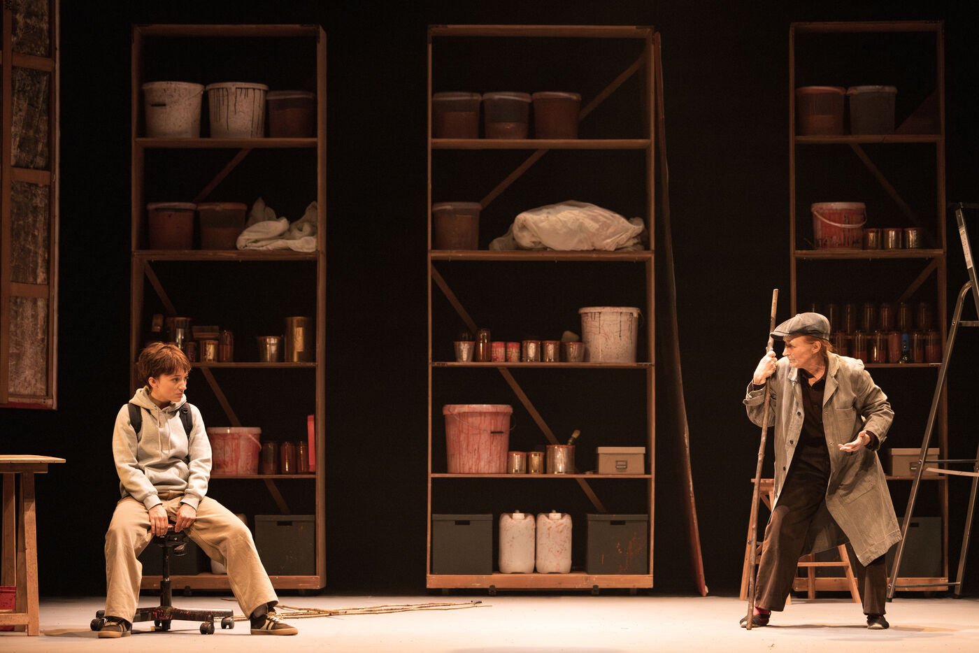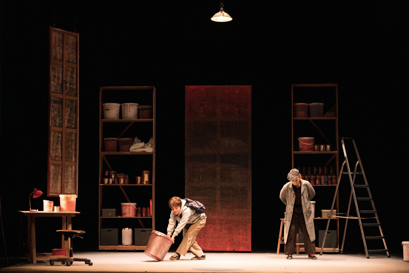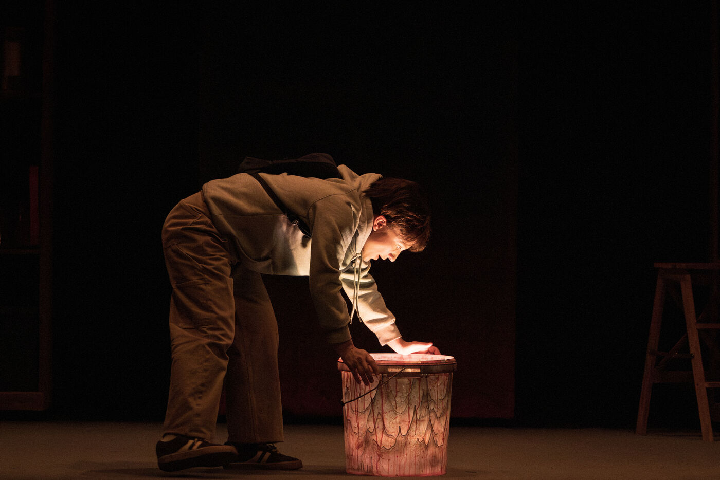 Sur la route d Eden / theatre creation. Written by La compagnie sans roi. Play and written by David Guez, directed by David Guez and Edouard Eftimakis. Set design and lighting: Manon Vergotte. Sound design: Mateo Esnault. Make-up: Tina Honic. Actors and actresses: Celine Cheenne, Hermine Dos Santos, Edouard Eftimakis, Alexandre Gonin, Thibaud Guillon-Marchi, David Guez, Paul Meynieux, Leila Muse, Candice Pauilhac. Premiered at the Theatre de Lisieux Normandie, France, on 6 May 2025. Photography by Nadege Le Lezec / Hans Lucas