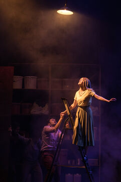 Sur la route d Eden / Creation de La compagnie sans roi. Ecrit par David Guez et mis en scene par David Guez et Edouard-Eftimakis. Scenographie et lumiere : Manon Vergotte. Conception sonore: Mateo Esnault. Maquillage : Tina Honic. Comediens et comediennes : Celine Cheenne, Hermine Dos Santos, Edouard Eftimakis, Alexandre Gonin, Thibaud Guillon-Marchi, David Guez, Paul Meynieux, Leila Muse, Candice Pauilhac. Creation au Theatre de Lisieux Normandie, France, le 6 mai 2025. Photographie par Nadege Le Lezec / Hans Lucas