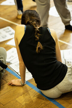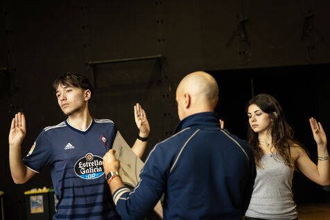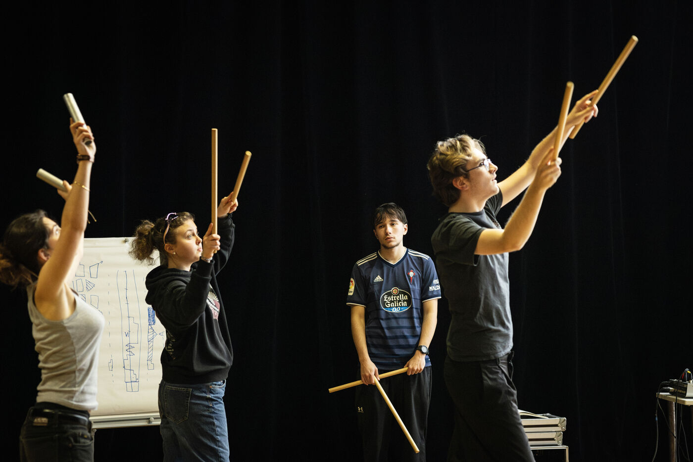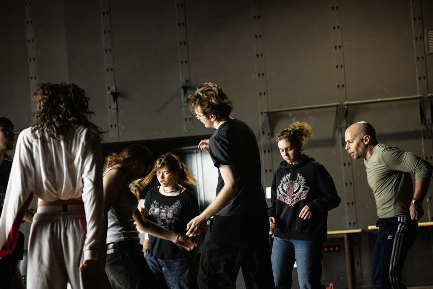 A workshop organised as part of the Les Adelphes mentoring programme by Le Théâtre Public de Montreuil. Young people aged 16 to 25 were mentored by choreographer Gaelle Bourges during the 2024-2025 season. Over the course of a season, they will discover how live performance and theatre work and experiment with ways of creating, sharing and building a collective project in Montreuil, France, on 21 February 2025. Photography by Nadège Le Lezec / Hans Lucas