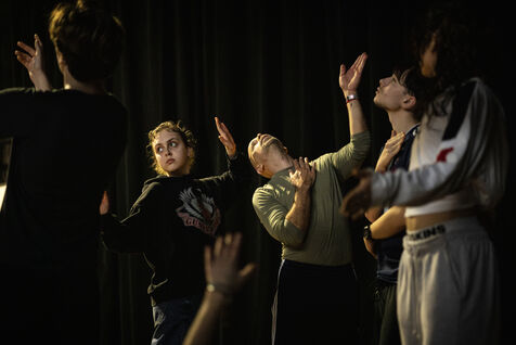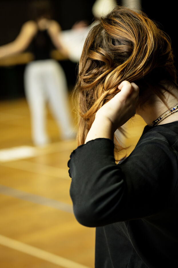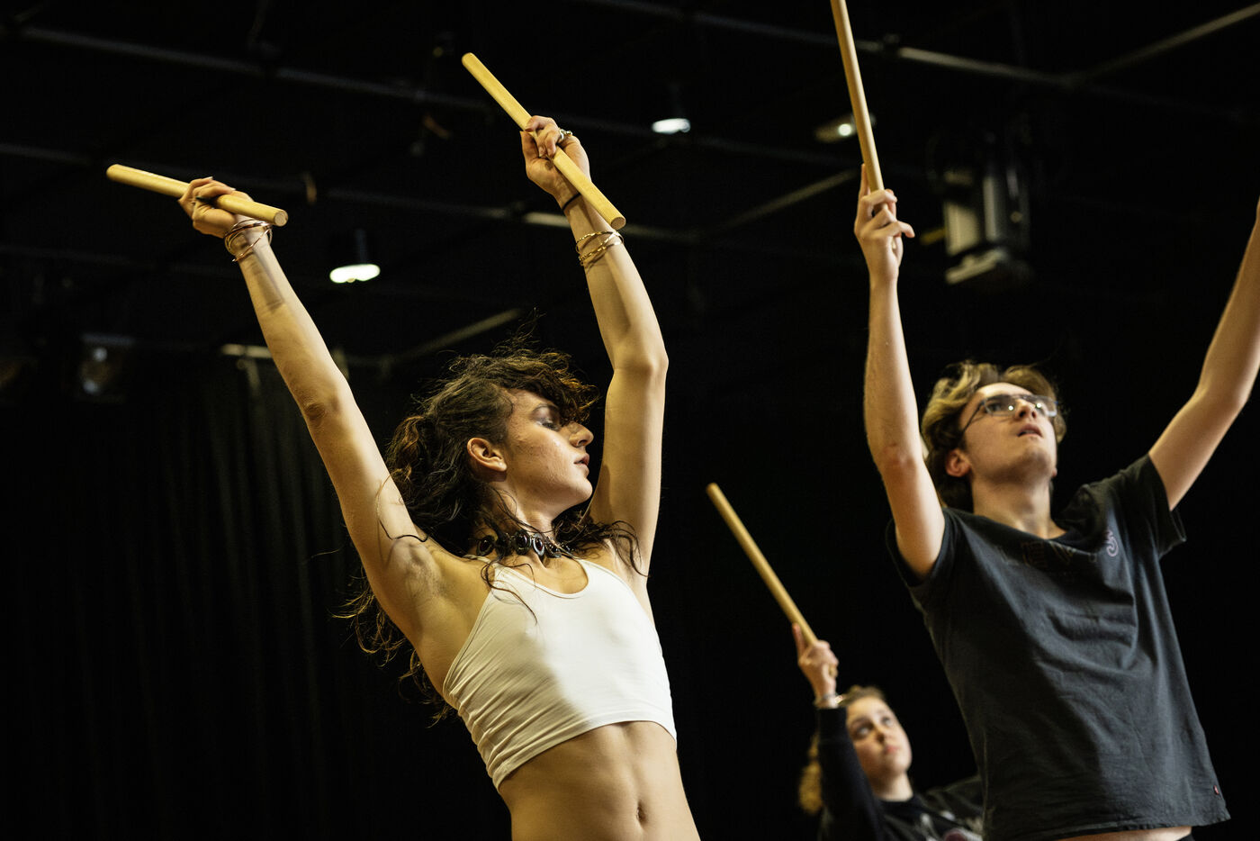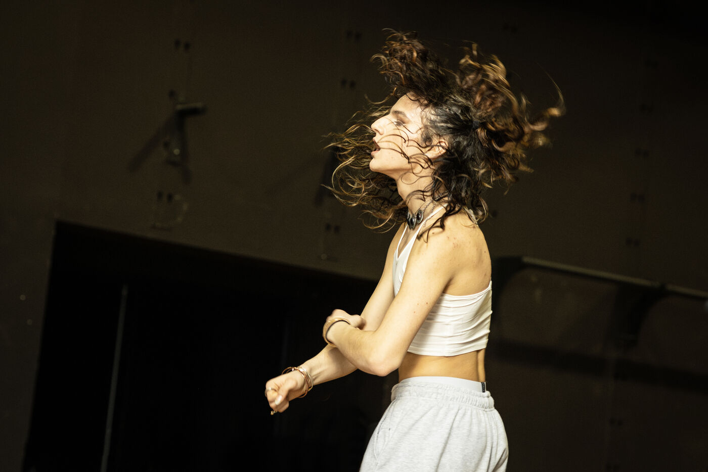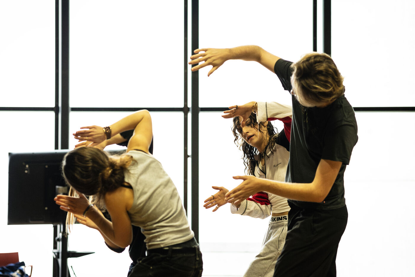 Un atelier réalisé dans le cadre du programme de mentorat Les Adelphes par Le Théâtre Public de Montreuil. Des jeunes âgé.es de 16 à 25 ans ont été accompagnés par la chorégraphe Gaelle Bourges sur la saison 2024 - 2025. Pendant une saison, ils découvrent le fonctionnement du spectacle vivant et du théâtre et expérimentent des moyens de créer de partager et de construire un projet collectif, à Montreuil en France le 21 février 2025. Photographie par Nadège Le Lezec / Hans Lucas