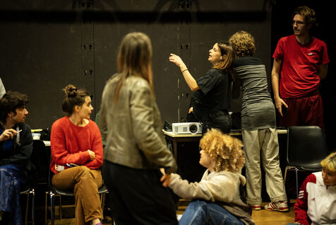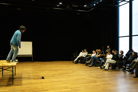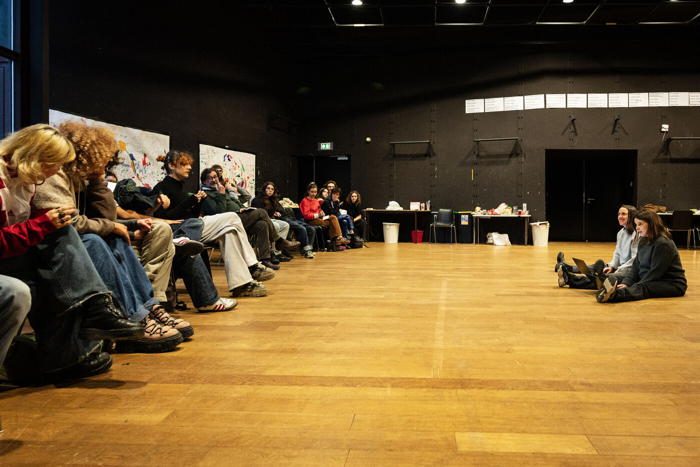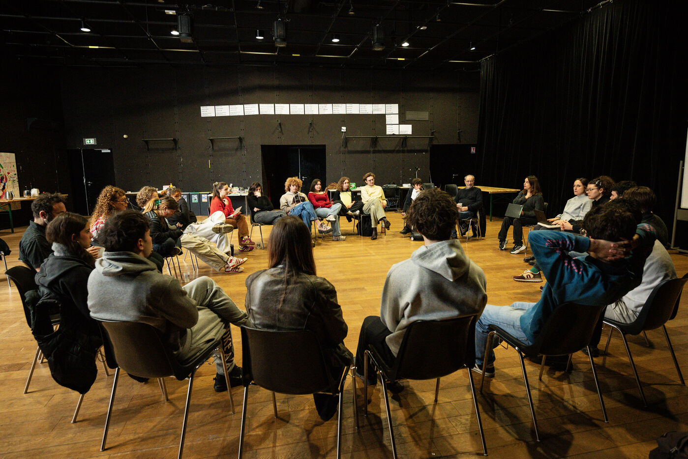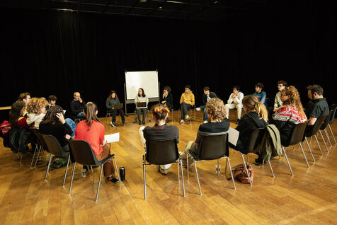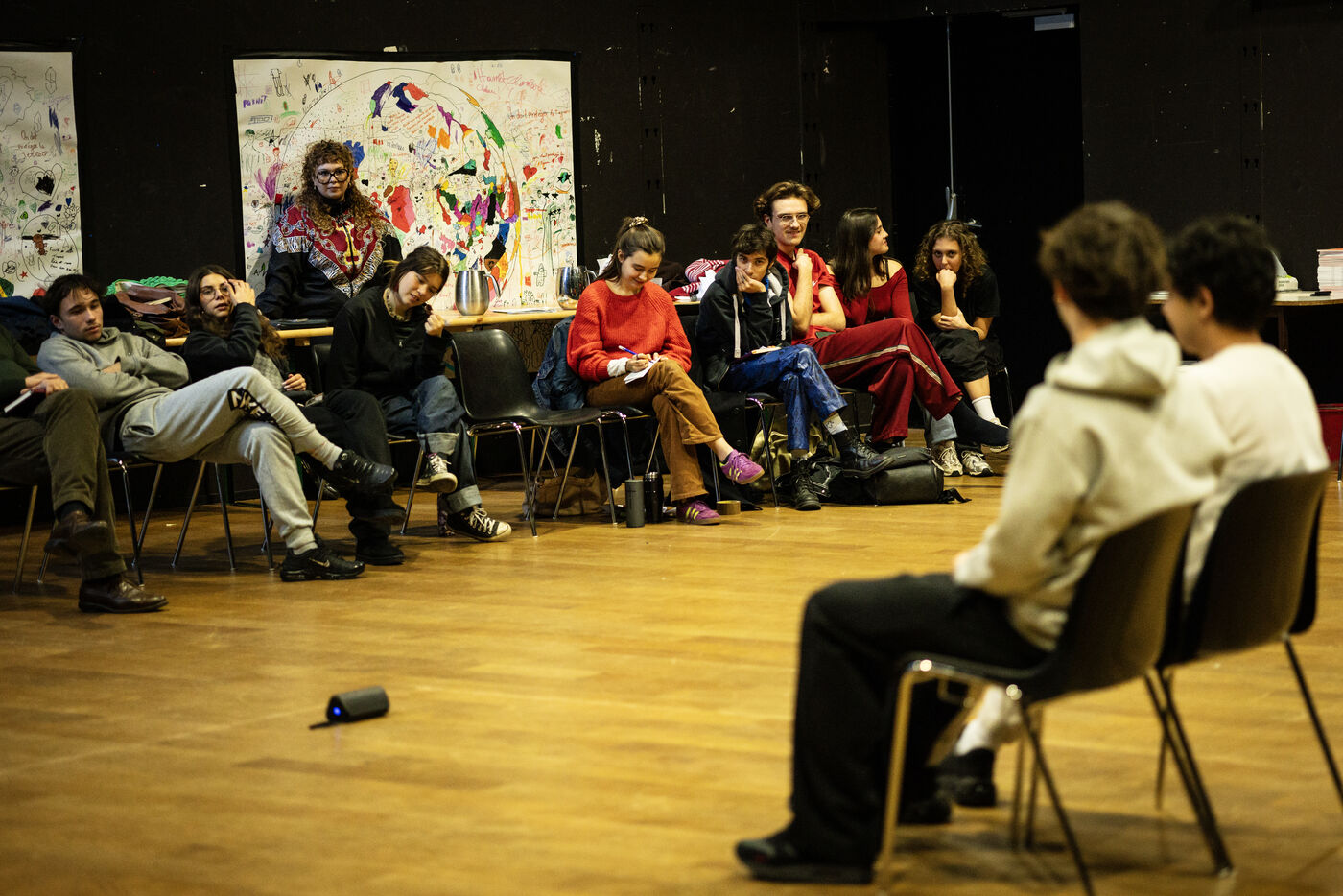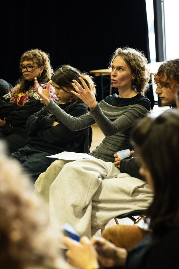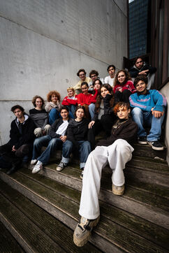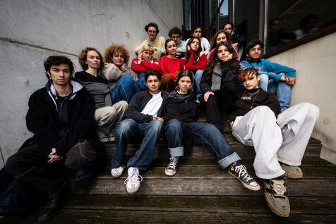 This series of photographs documents the theater workshop of a group called Les Adelphes, at the Théâtre Public de Montreuil, on December 6, 2025, supervised by the director of the Théâtre Public de Montreuil, Pauline Bayle. The Théâtre Public de Montreuil is launching the fourth edition of its Les Adelphes mentoring program for 16-25 year olds. The group will attend theater workshops throughout the 2025-2026 season. The program confirms the institution's commitment to young people. Participants will discover what goes on behind the scenes in live performance, experimenting with creation, sharing, and collective work.