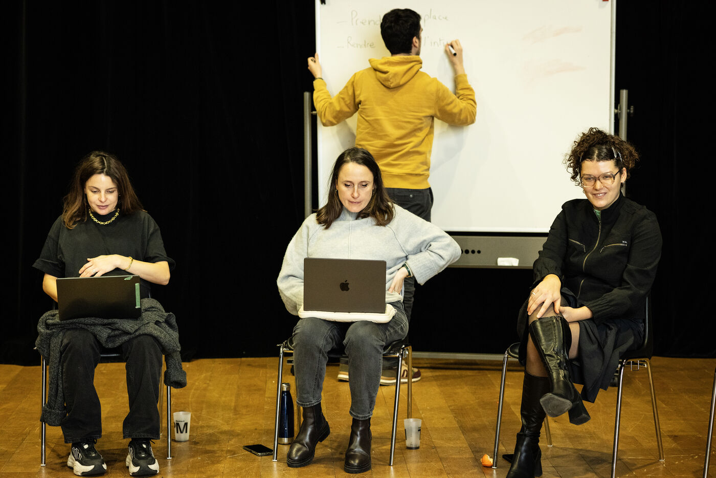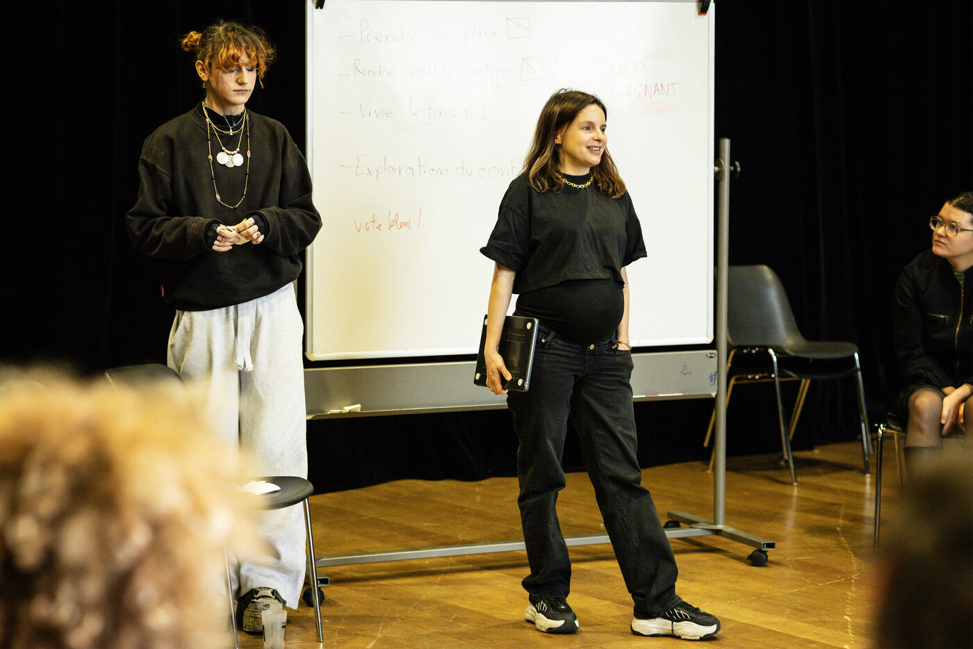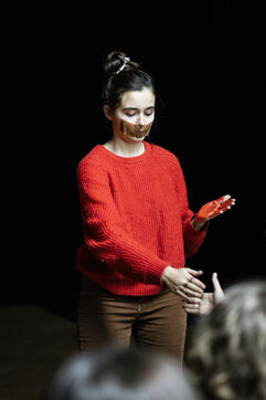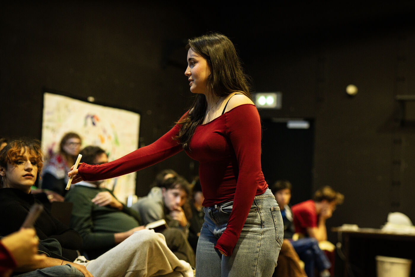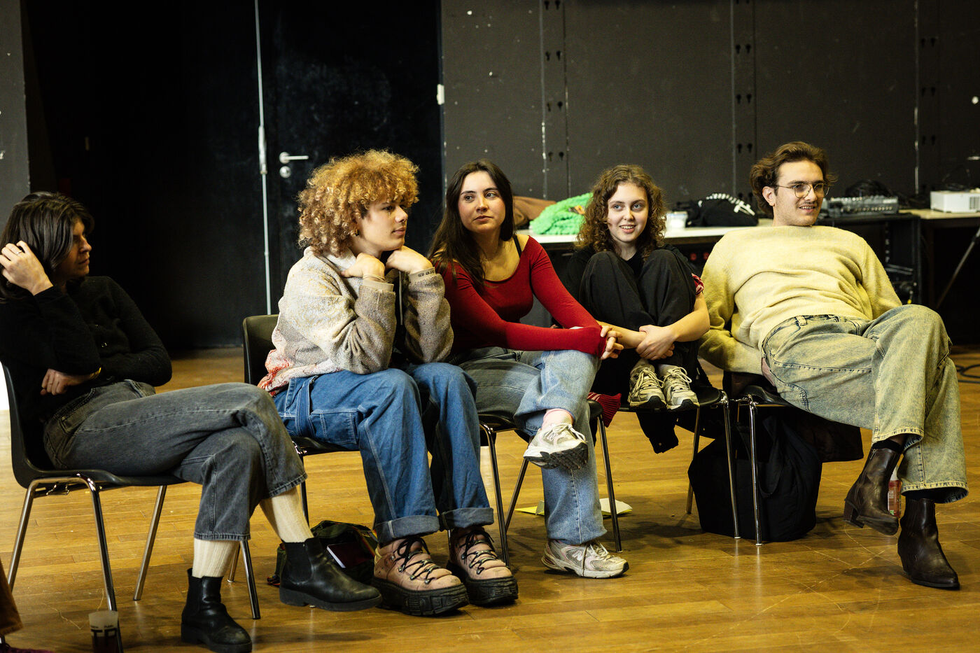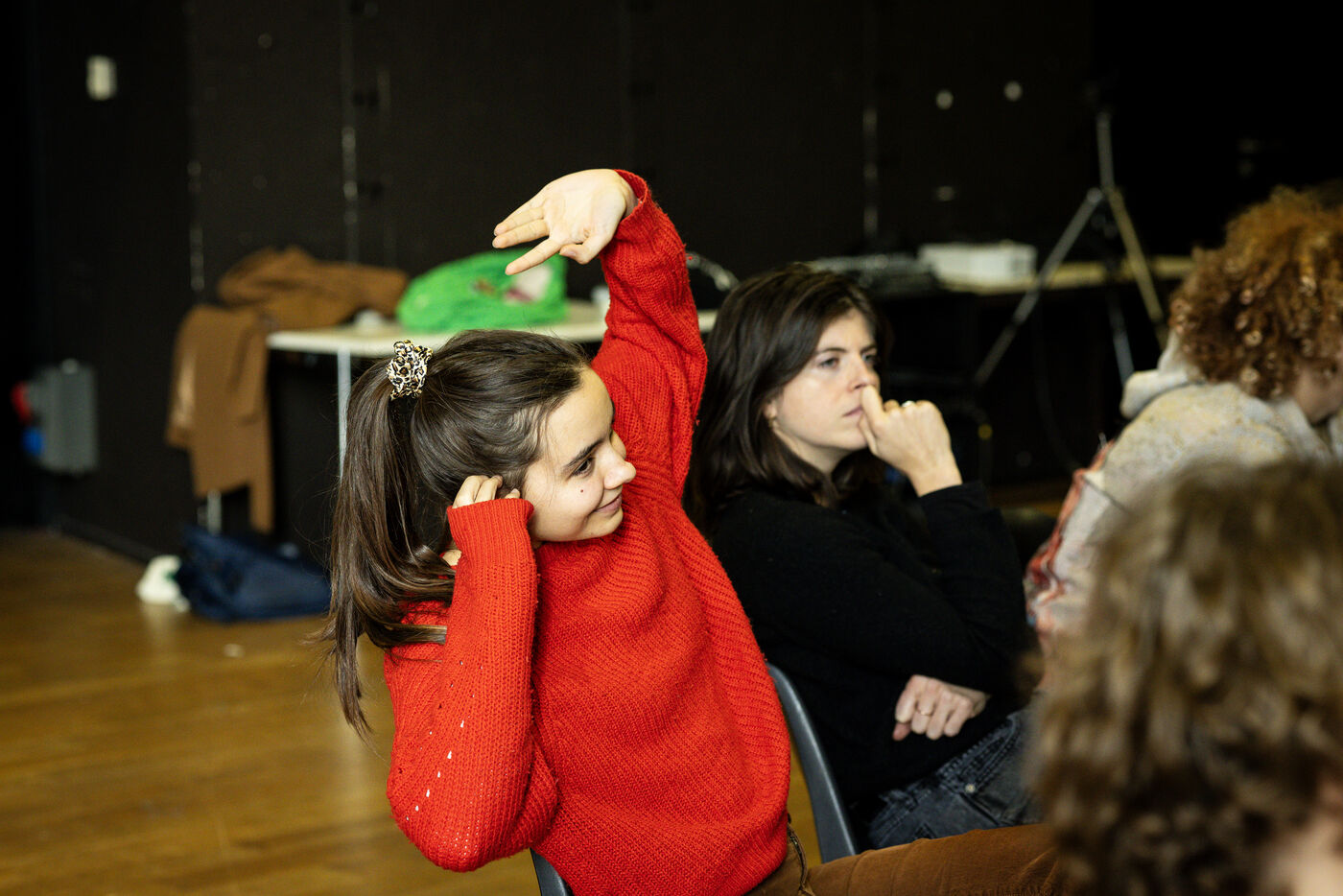This series of photographs documents the theater workshop of a group called Les Adelphes, at the Théâtre Public de Montreuil, on December 6, 2025, supervised by the director of the Théâtre Public de Montreuil, Pauline Bayle. The Théâtre Public de Montreuil is launching the fourth edition of its Les Adelphes mentoring program for 16-25 year olds. The group will attend theater workshops throughout the 2025-2026 season. The program confirms the institution's commitment to young people. Participants will discover what goes on behind the scenes in live performance, experimenting with creation, sharing, and collective work.