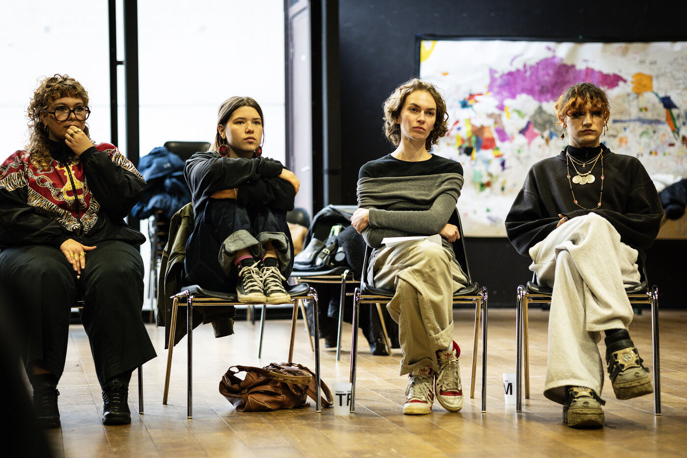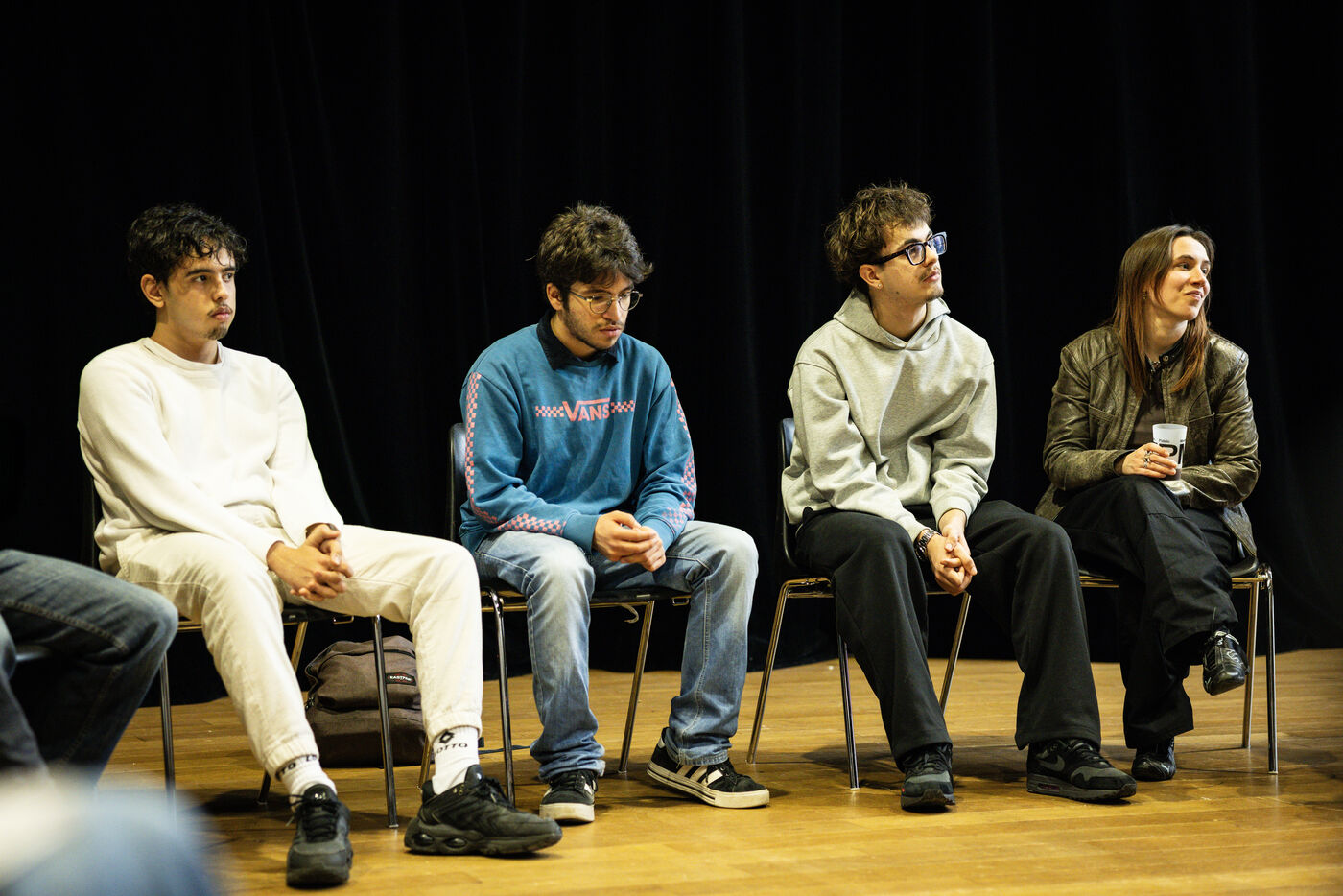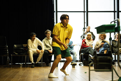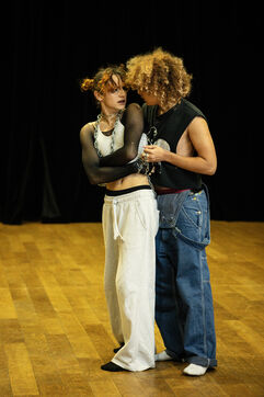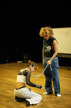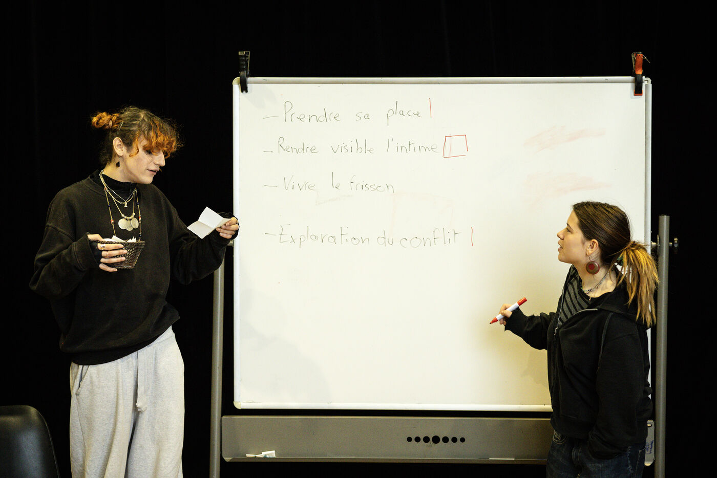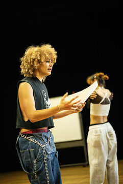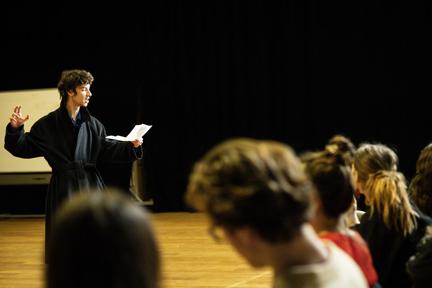 This series of photographs documents the theater workshop of a group called Les Adelphes, at the Théâtre Public de Montreuil, on December 6, 2025, supervised by the director of the Théâtre Public de Montreuil, Pauline Bayle. The Théâtre Public de Montreuil is launching the fourth edition of its Les Adelphes mentoring program for 16-25 year olds. The group will attend theater workshops throughout the 2025-2026 season. The program confirms the institution's commitment to young people. Participants will discover what goes on behind the scenes in live performance, experimenting with creation, sharing, and collective work.