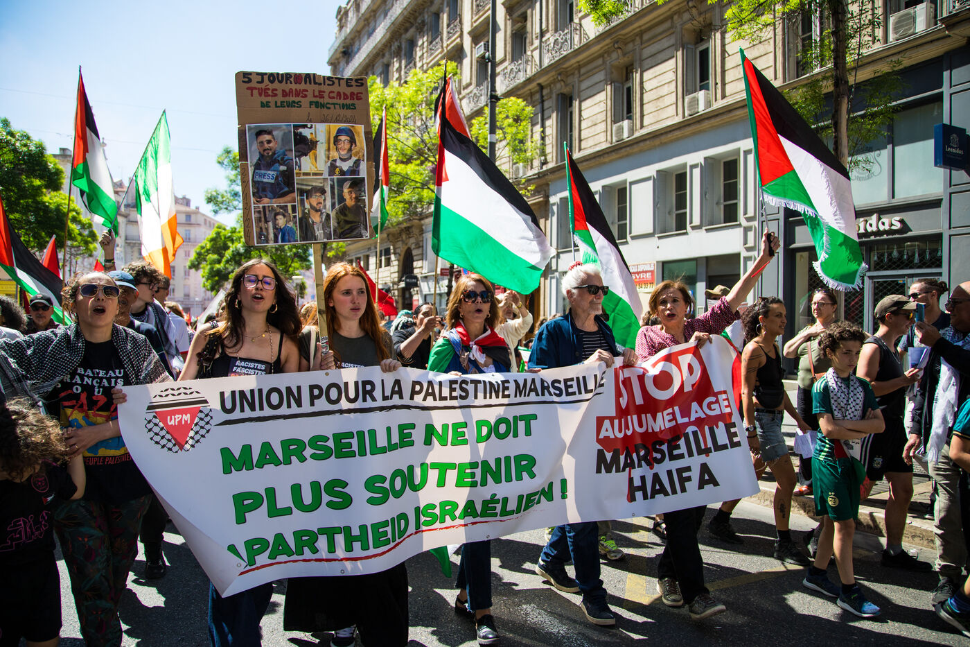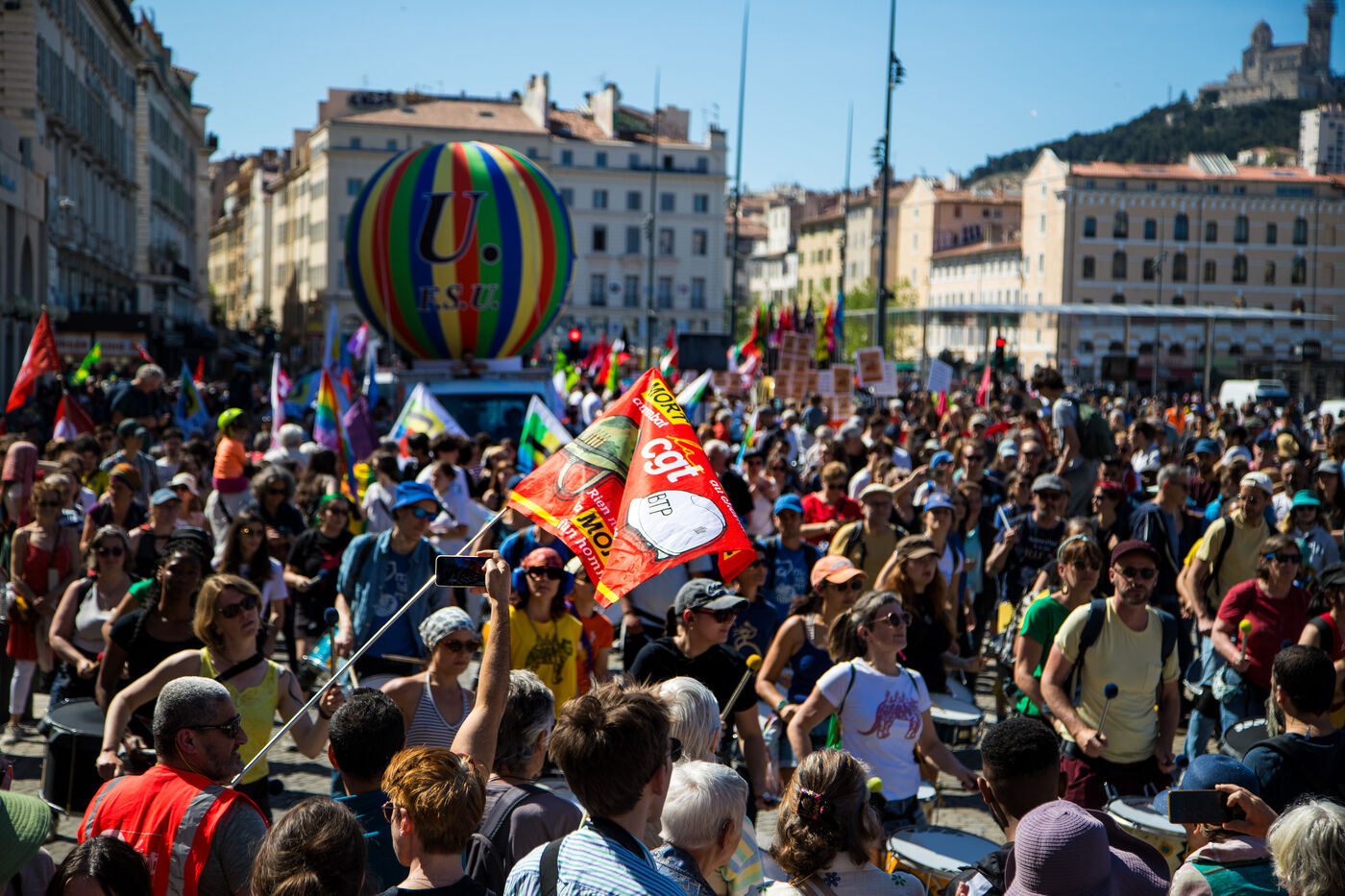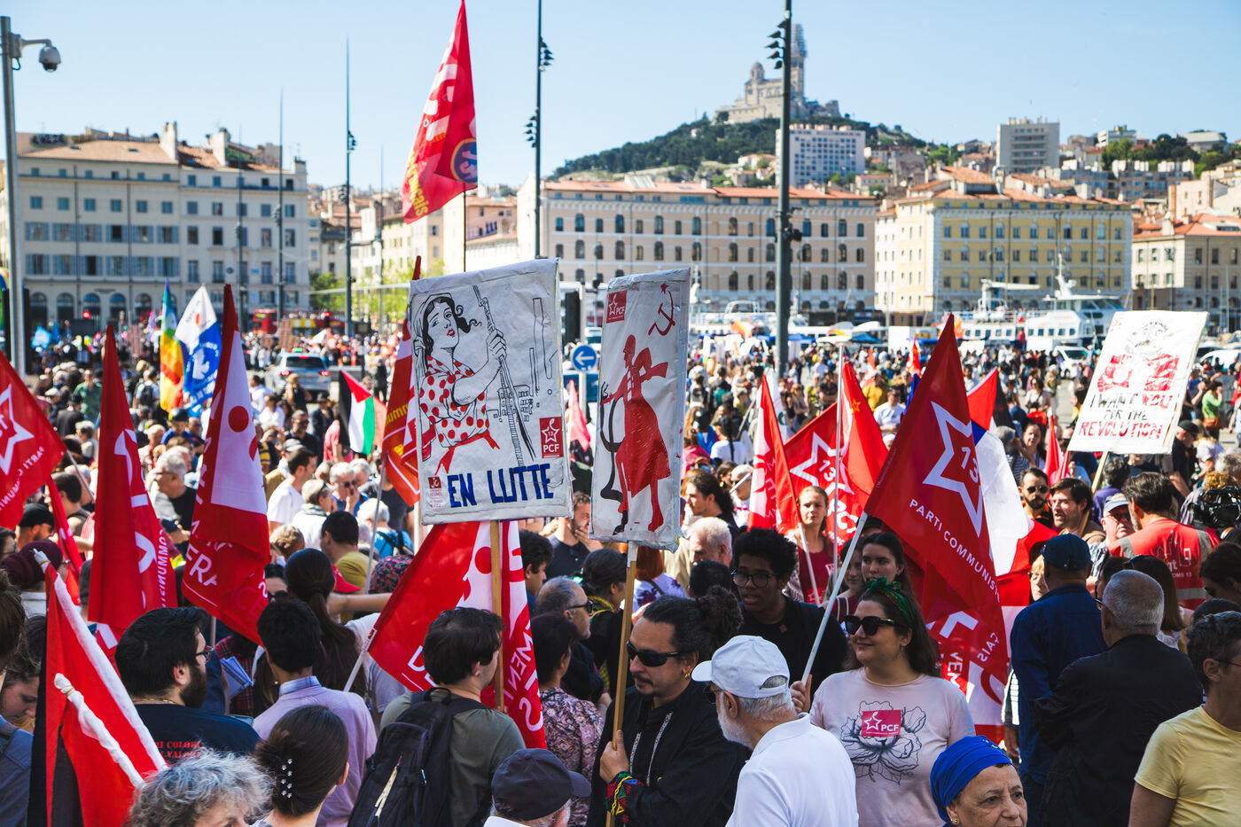 Manifestation syndicale à Marseille, dans le département des Bouches-du-Rhône, à l’occasion de la Fête du Travail le 1er mai 2025. Mobilisation de milliers de manifestants dans les rues du centre-ville pour revendiquer des droits sociaux et salariaux, dans un contexte de tensions sociales et économiques. Elle témoigne de la diversité des revendications portées par les syndicats, les organisations politiques de gauche et les citoyens engagés.
