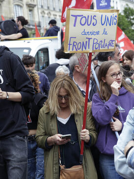 Les résultats des élections européennes, on mis en tête la liste du Rassemblement National conduite par Jordan Bardella. Pour répondre à cet état de fait, Emmanuel Macron a dessous l'assemblee nationale. Pour cette nouvelle compagne, les différentes parties ont noué des alliances. Aussi, est né le Nouveau Front Populaire qui regroupe un grand nombre de partis de gauche. Cette coalition est formet d'autres organisations syndicales ou associatives, ils ont organisé cette manifestation le 15 juin, pour appellé à faire barrage au RN.