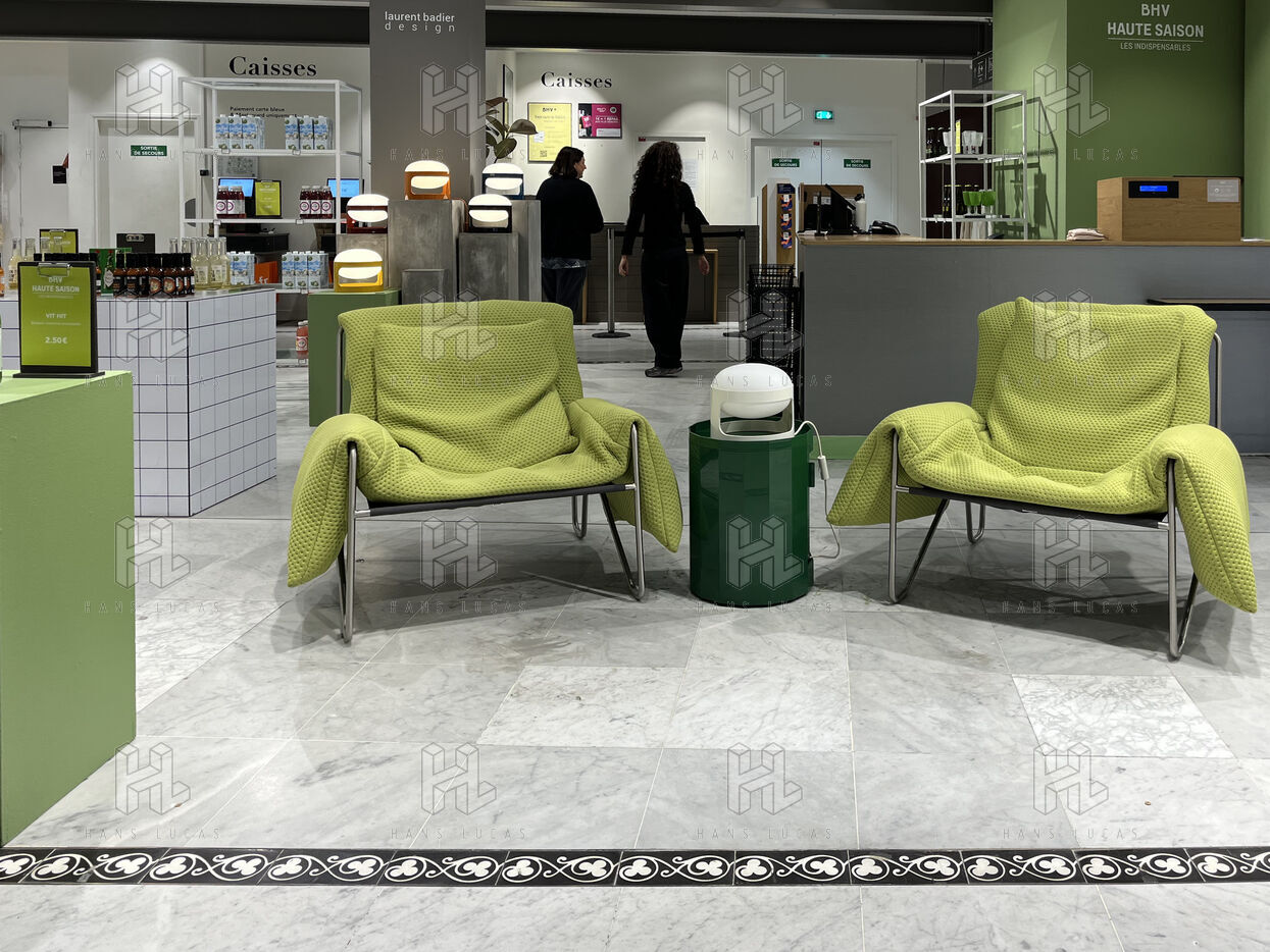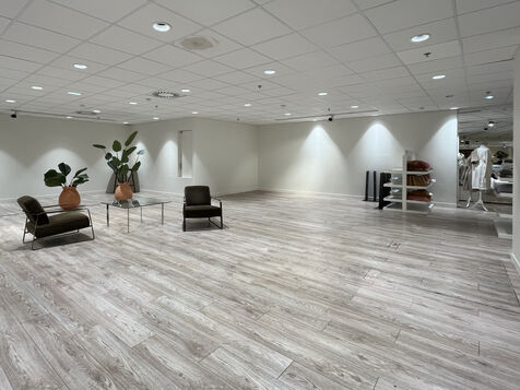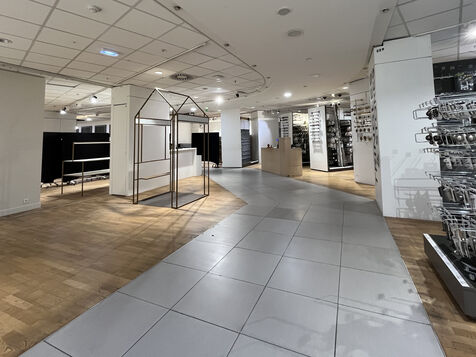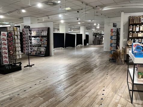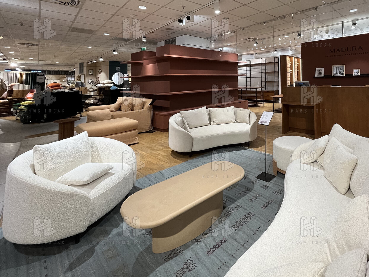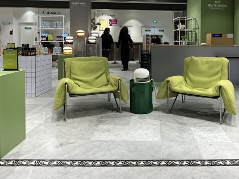 The store's layout has been rearranged with screens hiding the empty spaces but you still can see marks on the floor where the display furniture has been removed or replaced with lighter displays. Some areas are deserted, giving the impression of being in the back of the shop or in a warehouse. To fill the void, the shop has added several ‘relaxation corners’ with two armchairs and a coffee table, intended to offer a little rest in the middle of an exhausting day of shopping.