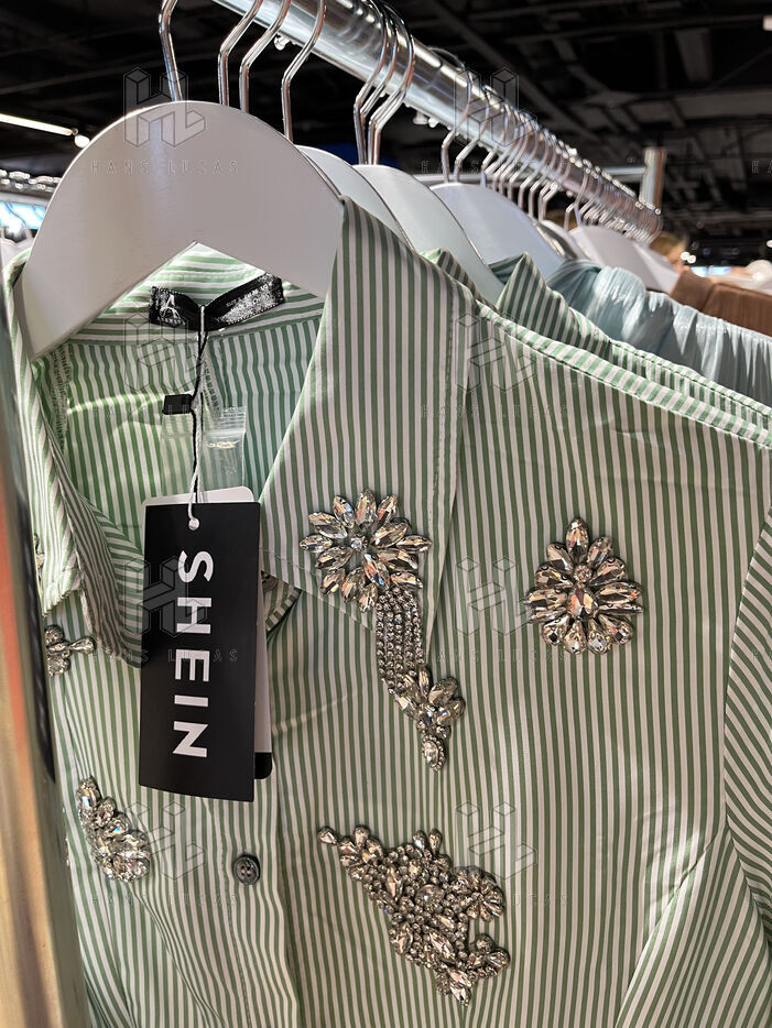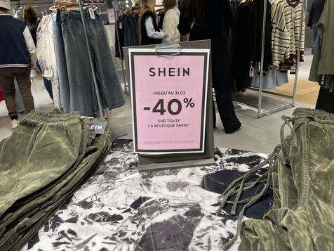 Au 6e, a l’etage SHEIN, le constat est le meme. En sortant de l’ascenseur, on est frappe par l’immense espace vide a traverser avant d’arriver a la surface de vente. Ici aussi, il y a moins de marchandise alors on l’etale. La marque est en promotion a -40% pour 1 mois. Pourtant, la batterie de 10 caisses dediees a la boutique chinoise est tragiquement deserte. Une seule caisse est ouverte.