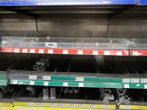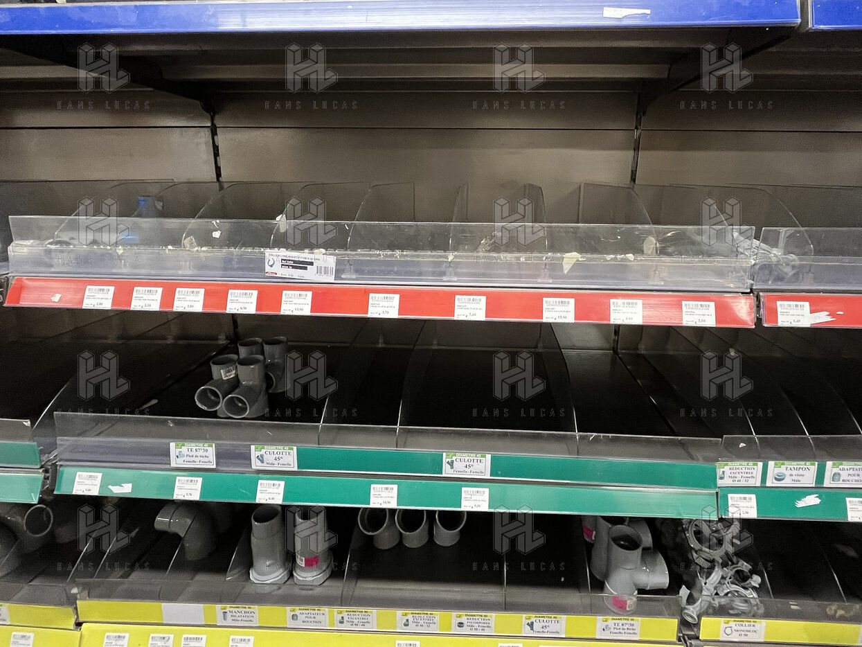 Beaucoup de rayons sont vides, plusieurs exemplaires d un meme produit sont disposes sur les racks mais derriere la premiere rangee, il n y a rien, ou encore on aligne consciencieusement toutes les couleurs d’un meme article sur 4 etageres pour occuper l espace. On voit que les vitrines sont remplies pour « meubler » et non pour exposer. Des batteries de caisses sont condamnees avec un meuble qui en barre l acces. Le magasin est desertique pour un vendredi apres-midi, il y a tres peu de clients et celui-ci ne trouve pas ce qu il veut…