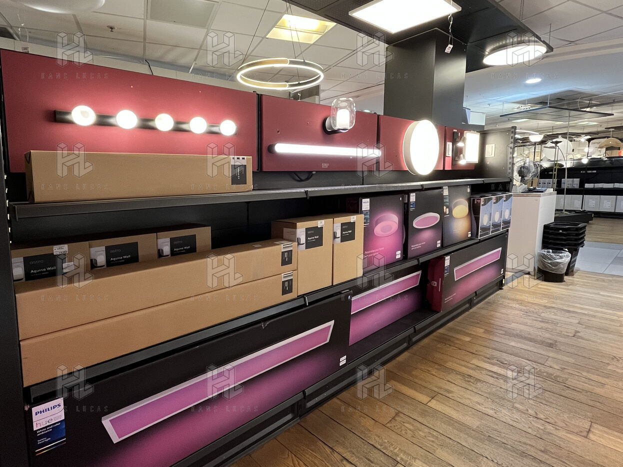 Les surfaces du magasin ont ete re-agencees, des paravents cachent le vide mais on voit au sol les emplacements des meubles de presentation disparus ou echanges pour des presentoirs plus legers. Certains endroits sont deserts et donnent l’impression de se trouver en arriere-boutique ou en entrepot. Pour remplir le vide, le magasin multiplie les « coins detente » avec 2 fauteuils et une table basse censes offrir un peu de repos au milieu d’une epuisante journee de shopping.