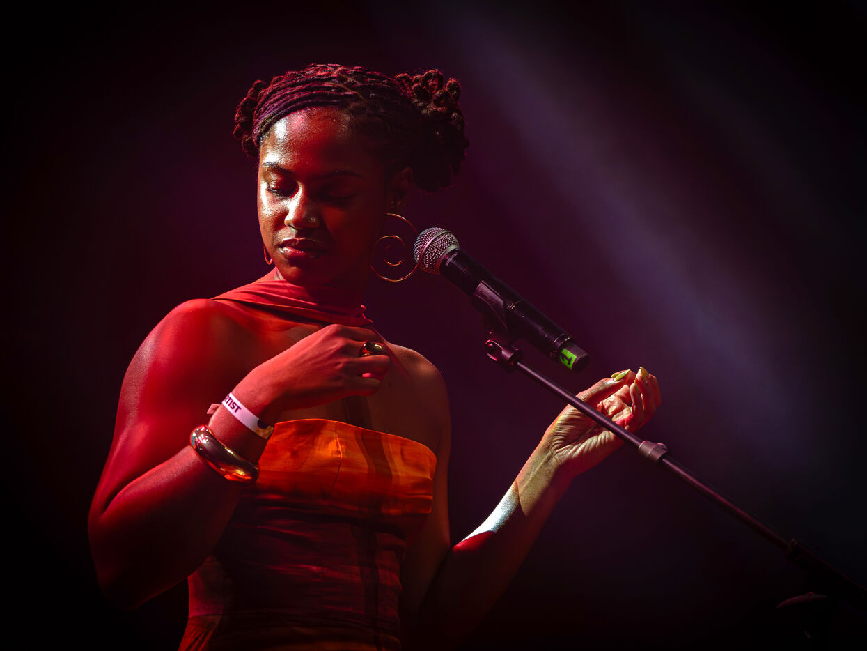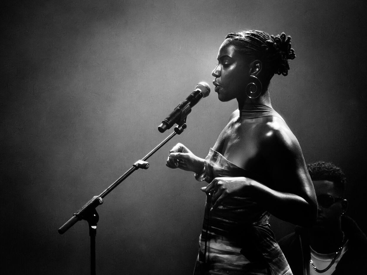 Maura Delgado performs on stage at the Mohamed V Theater during the 12th edition of the Visa for Music festival in Rabat Morocco on November 21, 2025. Maura Delgado a Cape Verdean artist blends R&B Afrobeat jazz and traditional Cape Verdean sounds. Created in 2014, Visa For Music is the leading music festival and market in Africa and the Middle East. It is held annually over four days in November in Rabat, Morocco.
