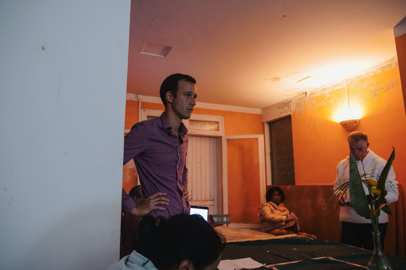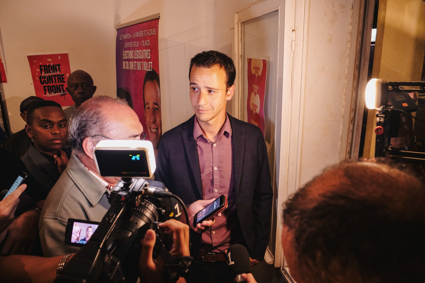 Second tour des élections législatives en France, soirée électorale au QG d'Alexis Chaussalet. Le candidat NFP (Nouveau Front Populaire) de la 3e circonscription à la Reunion, Alexis Chaussalet, affrontait le candidat RN (Rassemblement National) Joseph Rivière. Le candidat RN l'emporte avec 51% des voix contre 49% pour Alexis Chaussalet. C'est la première fois que le département ultramarin envoie un député RN à l'Assemblée Nationale. Pendant que les militants et soutiens se rassemblent dans la pièce principale pour regarder les résultats en direct, le candidat de 31 ans et son entourage proche comptabilisent les résultats qui arrivent au fur et à mesure, bureau par bureau, dans une petite pièce au fond du bâtiment. Les scores sont extêmement serrés. L'ambiance est un mélange d'espoir, d'inquiétude et d'ascenseurs émotionnels.