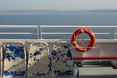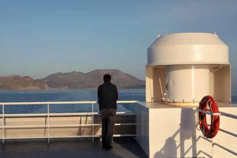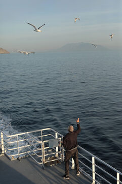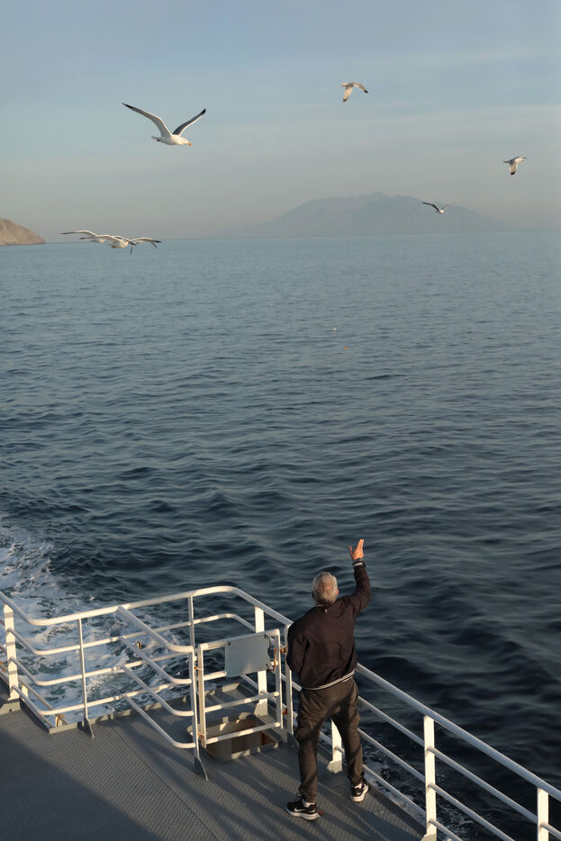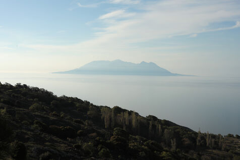 From the prow, I begin to see Imbros slowly emerging through the morning fog, and a few degrees further north, Samothraki appears in blue.