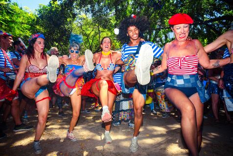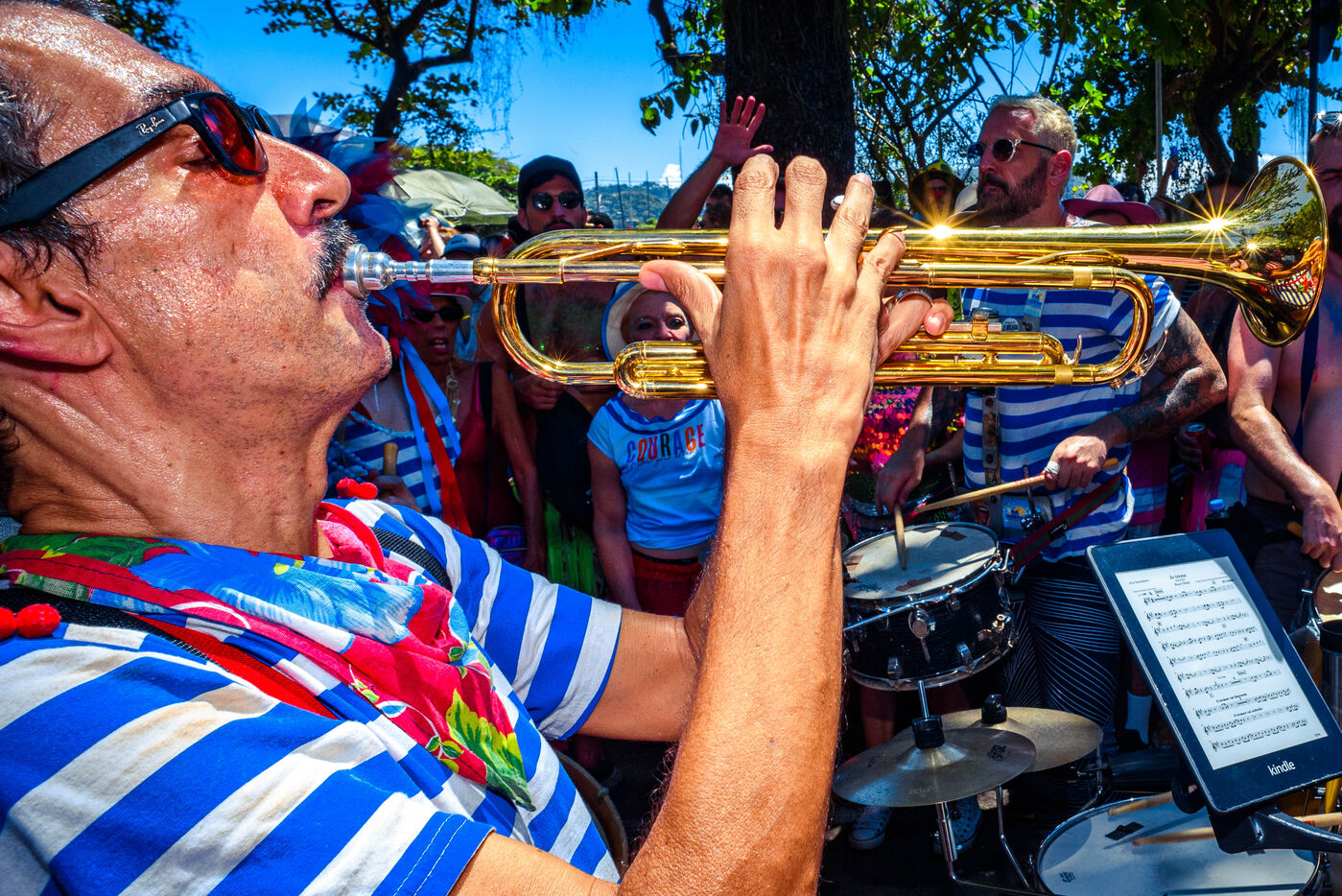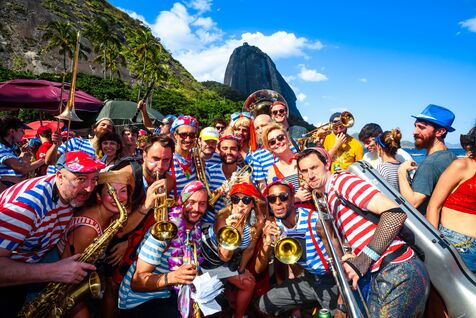 Founded in August 2023 and fully realized by February 2024, Ulalaô embodies the spirit of cultural exchange. Its members—half French and/or mixed European, half Brazilian—perform side by side, constantly welcoming visiting musicians from both nations. Their debut parade in Urca, set against the breathtaking backdrop of Sugarloaf Mountain, brought together over 2,000 revelers. In 2024, they shared the stage with Toulouse’s Fülü; in 2025, they welcomed French, Brazilian and other European musicians from far and wide for their grand carnival parade on March 3rd at Quadrado da Urca.