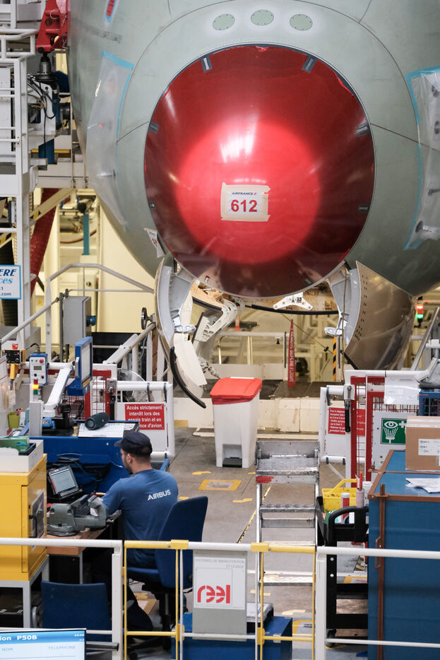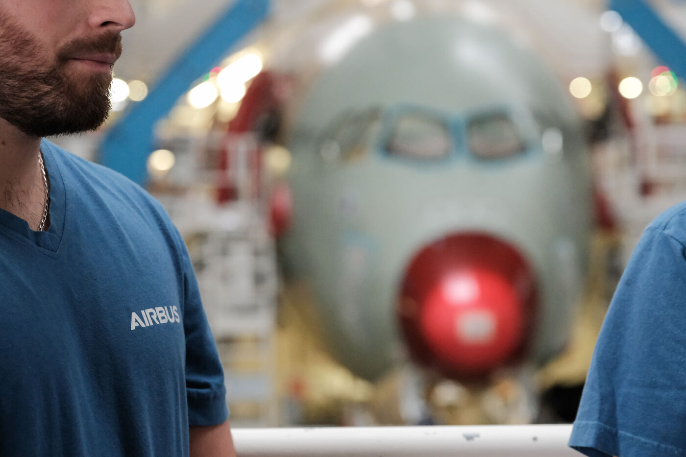 France, Colomiers, 2022-12-08. Visite de la chaîne d'assemblage Final (FALs) de l'appareil A350 d'Airbus, sur son site historique en banlieue de Toulouse.