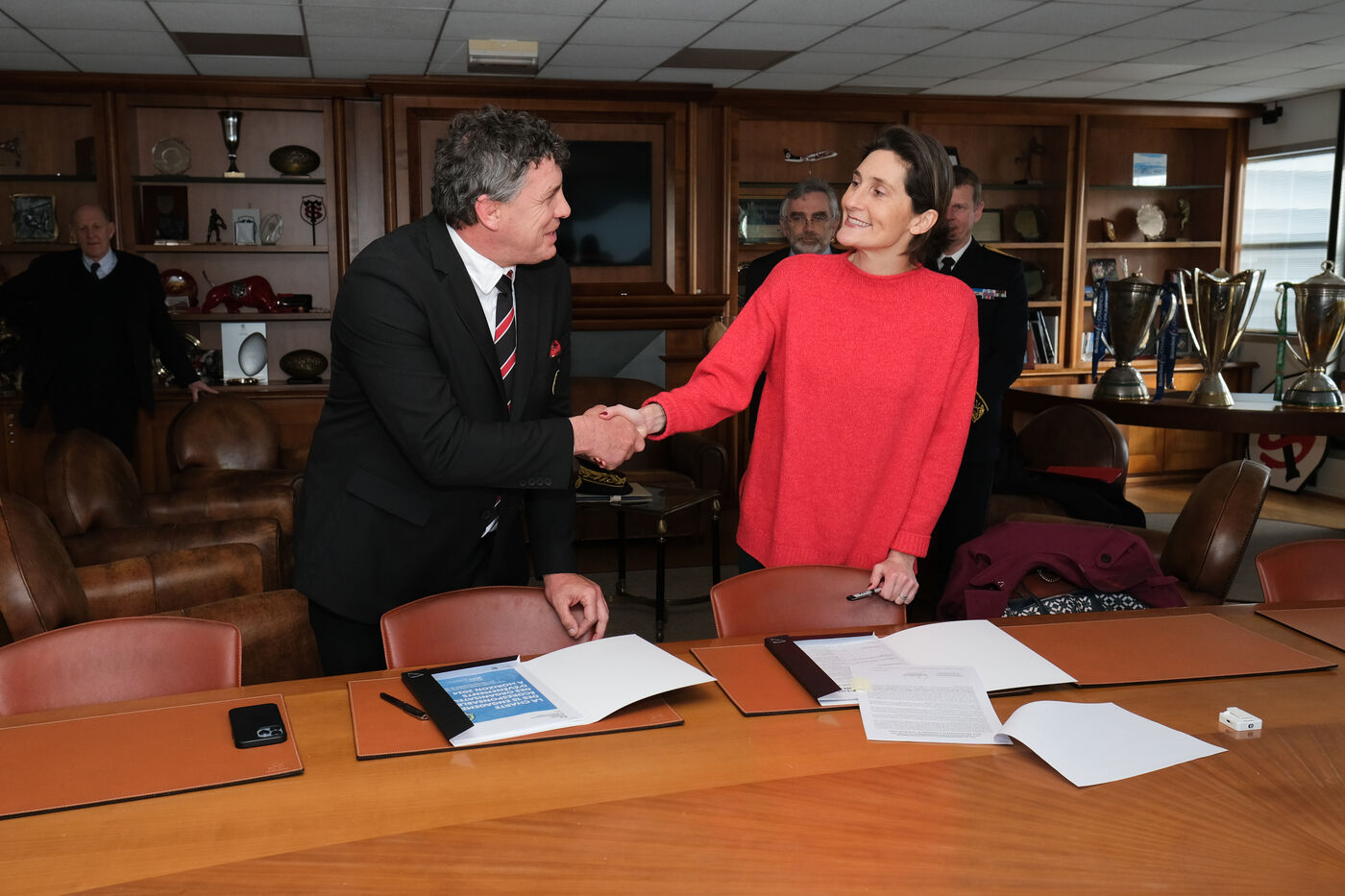 Toulouse, France, 2023-01-19. The Minister for Sport, Amélie Oudéa-Castéra, visited the Stade Toulousain to meet the teams and sign the charter of 15 eco-responsible commitments for sports event organisers with the rugby club. The themes of the charter are mobility, sustainable food, preservation of biodiversity and waste management and reduction. By 2024, the signatories must have adopted a responsible purchasing policy and use sustainable mobility for at least 90% of their travel.
