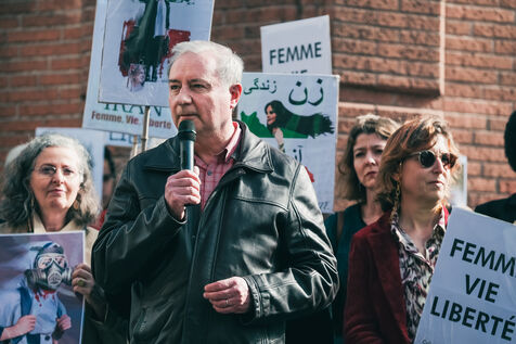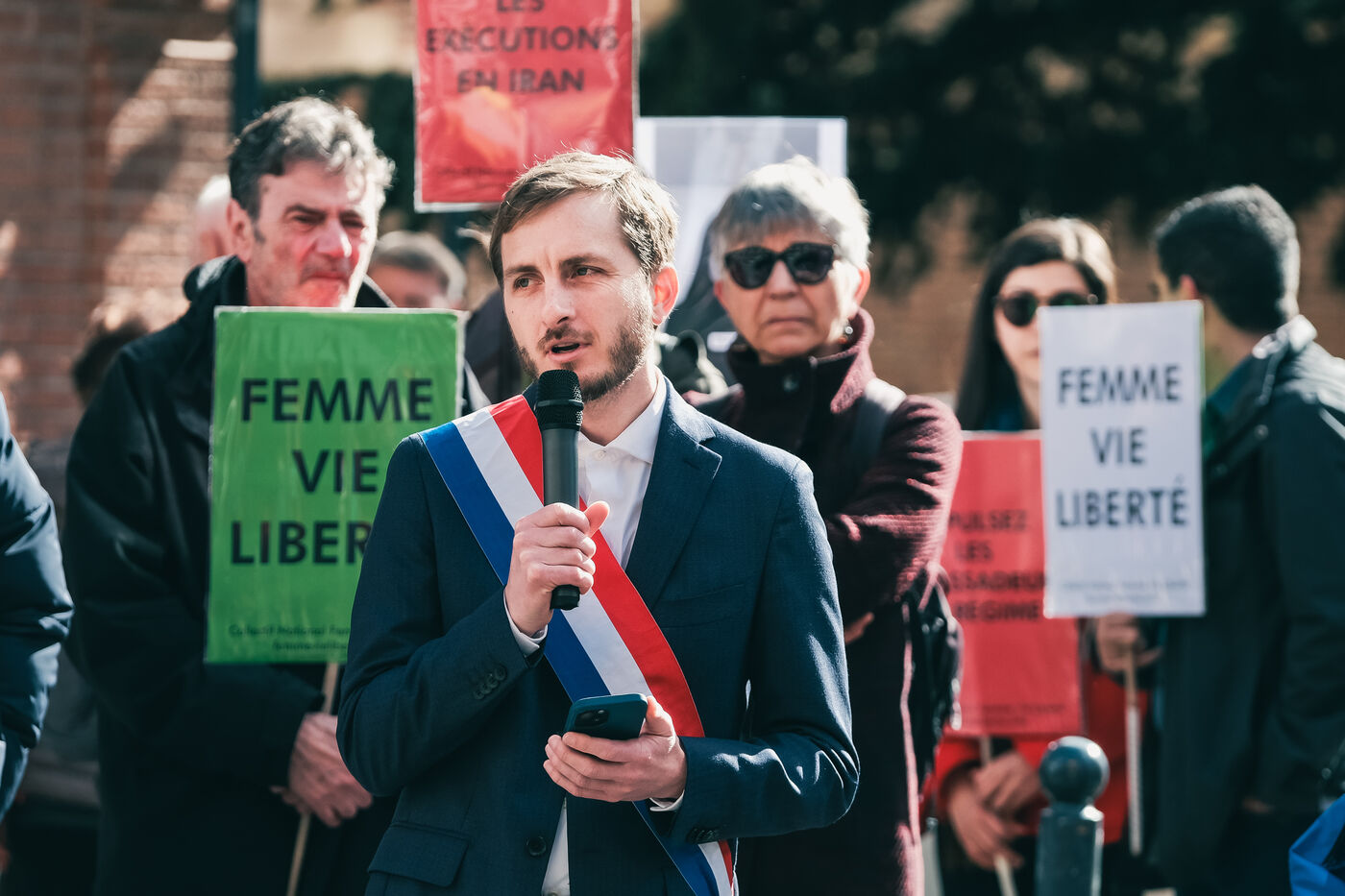 Toulouse, France, 2023-03-12. Manifestation de la diaspora iranienne avec participation d'élus locaux et nationaux. Le soulevement populaire est apparu en Iran il y a six mois de cela, après la mort de Jani Mahsa Amini; depuis, la répression du régime des mollahs a arrêté massivement des manifestants, puis procédé à des exécutions. Depuis quelques semaines, des écolières sont prises de mystérieuses intoxications par gaz.