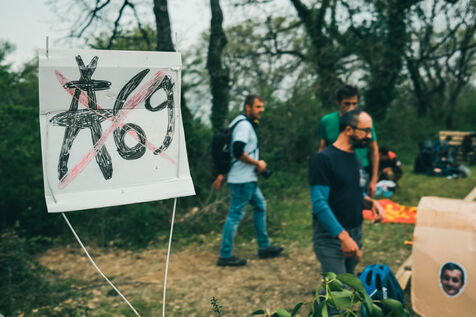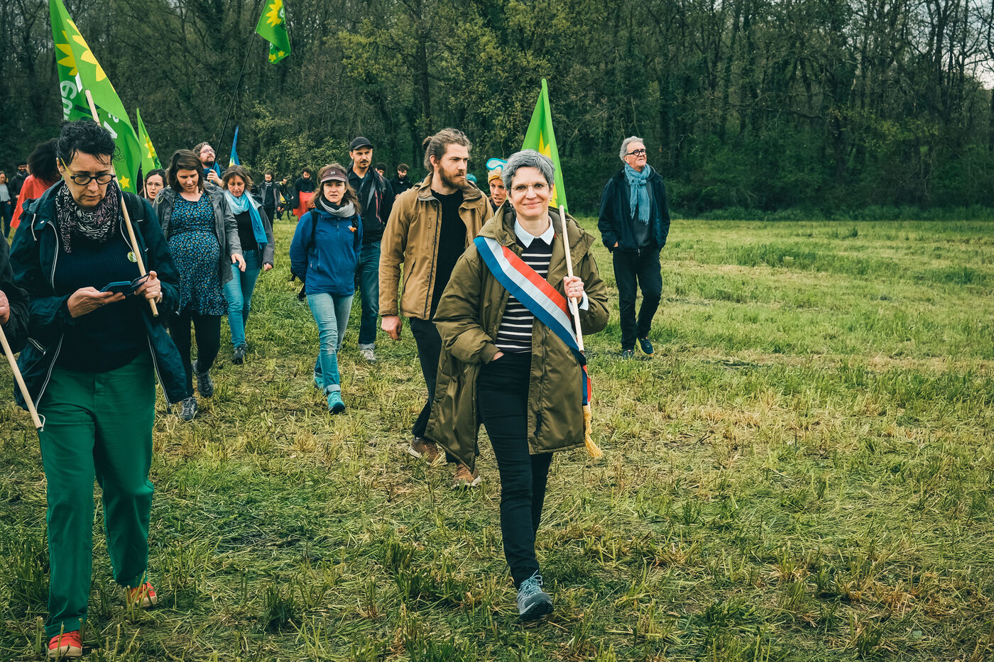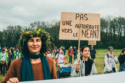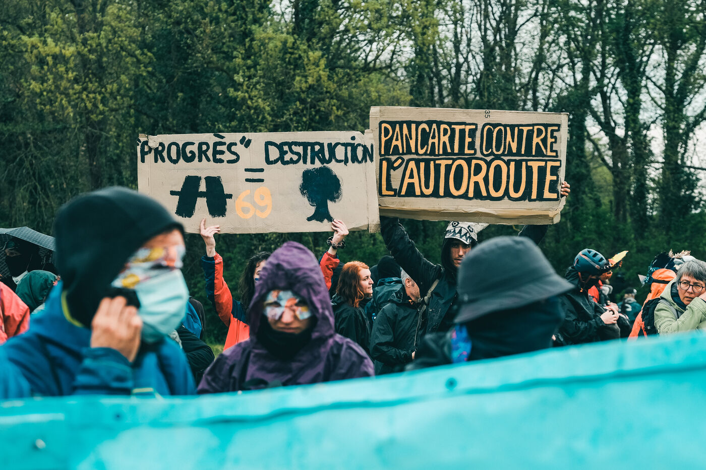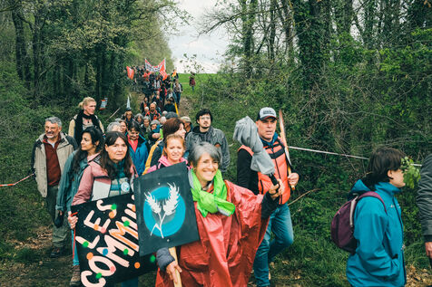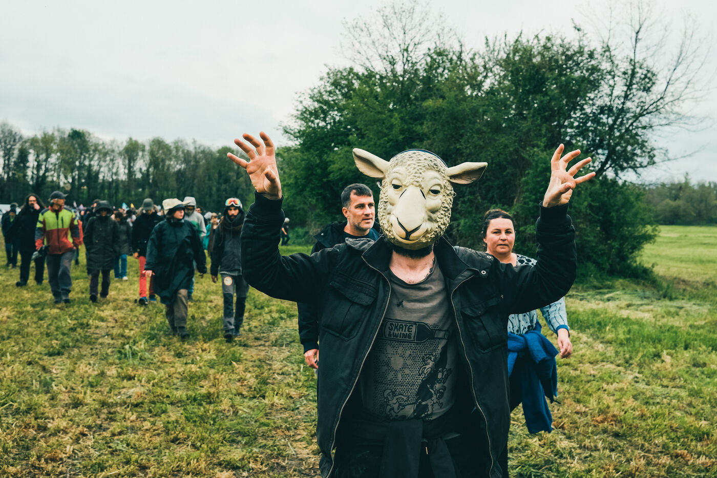 Saix, France, 2023-04-22. A l'appel de différents collectifs, une manifestation contre le chantier de l'autoroute A69 Toulouse-Castres a rassemblé plusieurs milliers de personnes. Soutenu par l'Etat et la Région Occitanie, le projet initié il y a plus de trente ans est l'objet d'une opposition locale massive. Selon eux, l'autoroute serait un chantier anachronique, remplaçant 400 ha de terres agricoles en bitume et béton, et pour un trafic routier insuffisant, un temps gagné faible et un tarif exorbitant. Les opposants proposent une alternative avec l'aménagement de la route nationale N126 déjà existante. La manifestation s'est déroulée dans le calme et sans débordements; un dispositif de 800 gendarmes avait été déployé.
