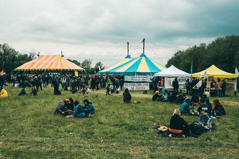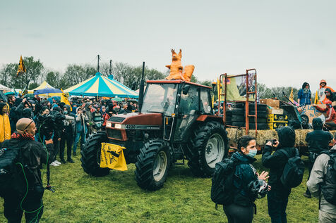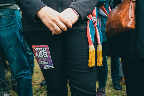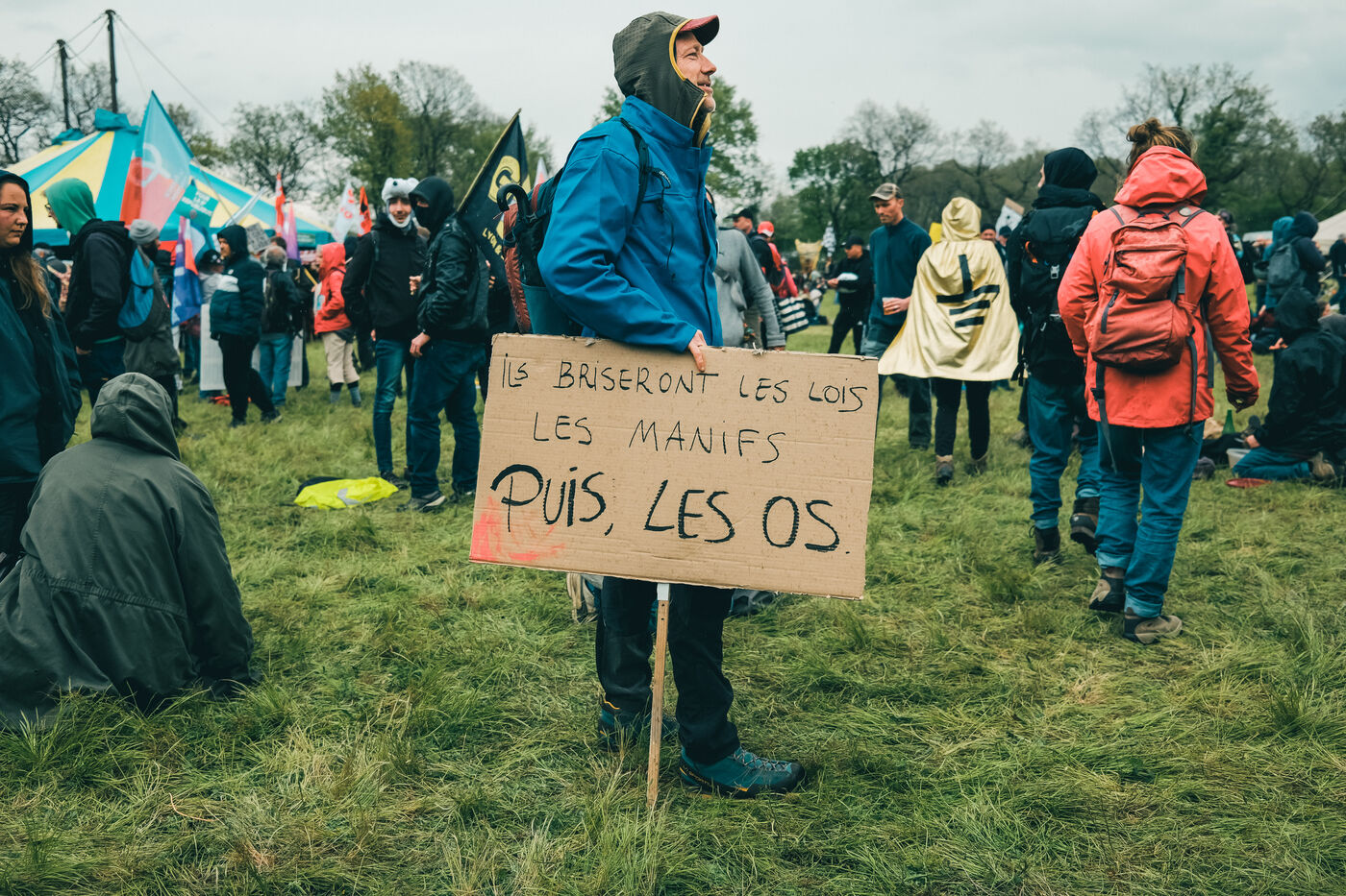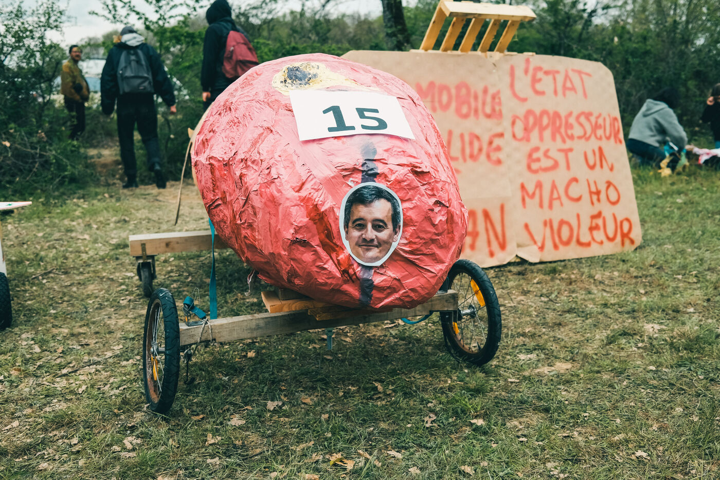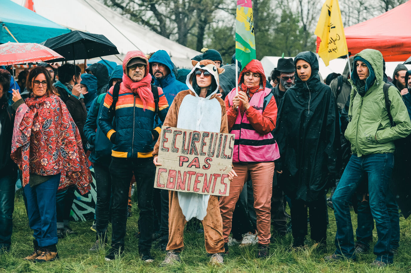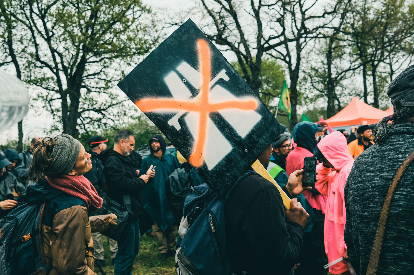 Saix, France, 2023-04-22. A l'appel de différents collectifs, une manifestation contre le chantier de l'autoroute A69 Toulouse-Castres a rassemblé plusieurs milliers de personnes. Soutenu par l'Etat et la Région Occitanie, le projet initié il y a plus de trente ans est l'objet d'une opposition locale massive. Selon eux, l'autoroute serait un chantier anachronique, remplaçant 400 ha de terres agricoles en bitume et béton, et pour un trafic routier insuffisant, un temps gagné faible et un tarif exorbitant. Les opposants proposent une alternative avec l'aménagement de la route nationale N126 déjà existante. La manifestation s'est déroulée dans le calme et sans débordements; un dispositif de 800 gendarmes avait été déployé.