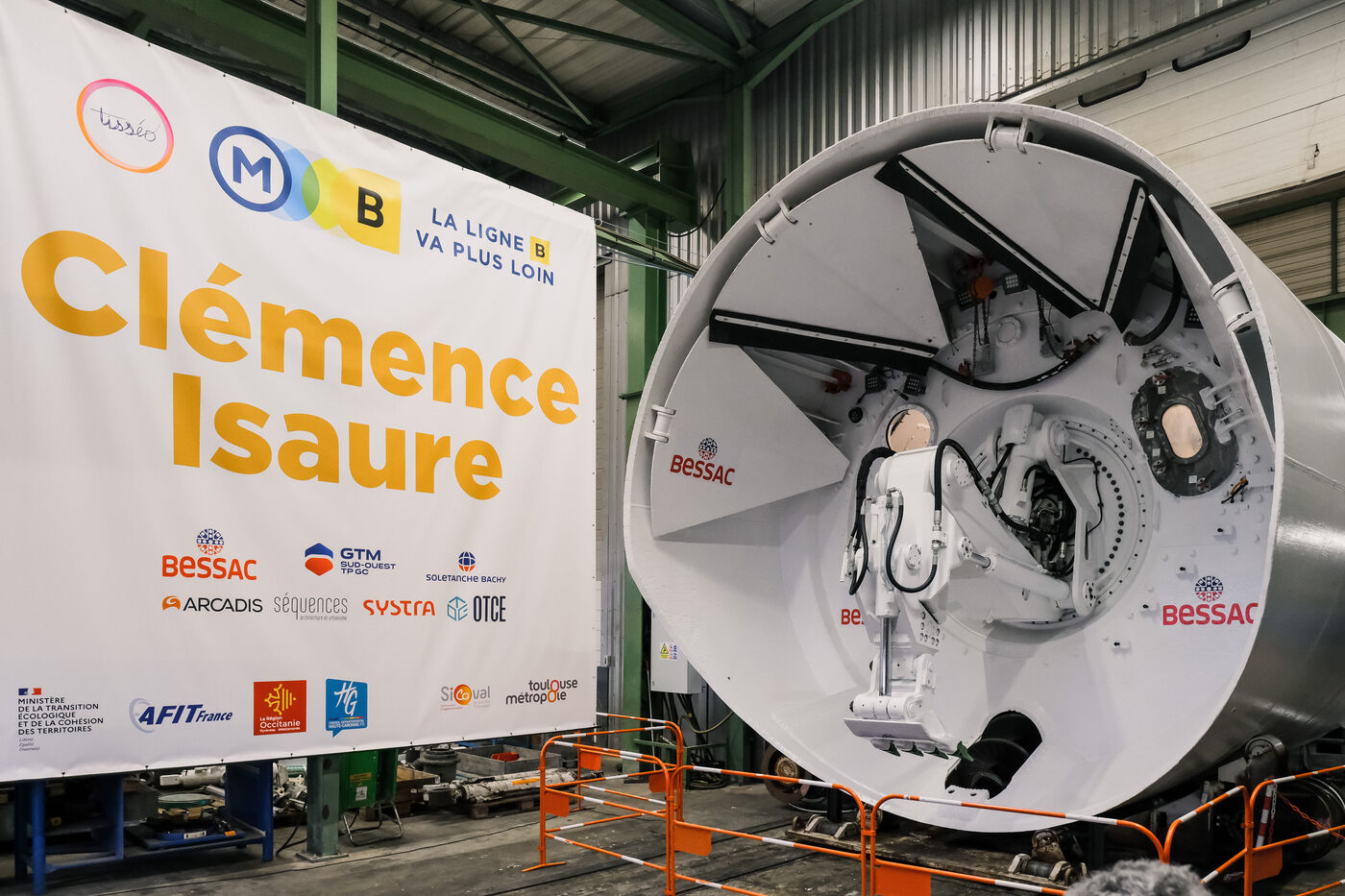 Saint-Jory, France, 2024-01-11. Pour le prolongement de la ligne B du métro de Toulouse, et sa jonction avec la ligne C en construction, Tisséo a dévoilé le tunnelier qui sera chargé de creuser sous le Canal du Midi. Fabriqué par l'entreprise locale Bessac, l'engin de type tunnelier à confinement, qui a déjà été utilisé sur d'autres chantiers, mesure plus de 5m de diamètre et est équipé d'une cabine pressurisée pour creuser en terrain alluvionnaire.
