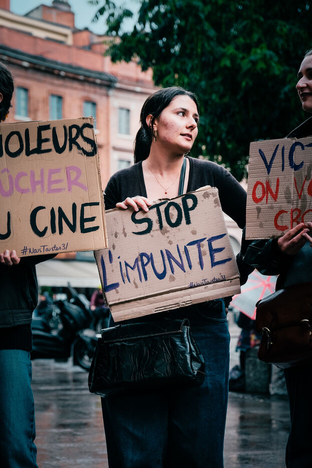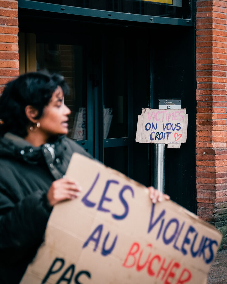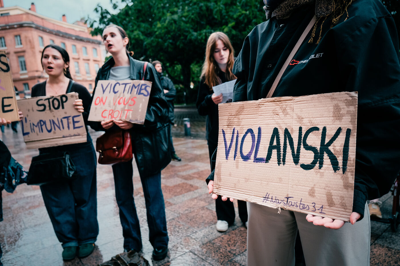 Rally organized by the feminist collective 'Nous Toutes' against the release of Roman Polanski's latest film 'The Palace' in front of the Pathé theater in Toulouse, southwest of France, on May 15, 2024.