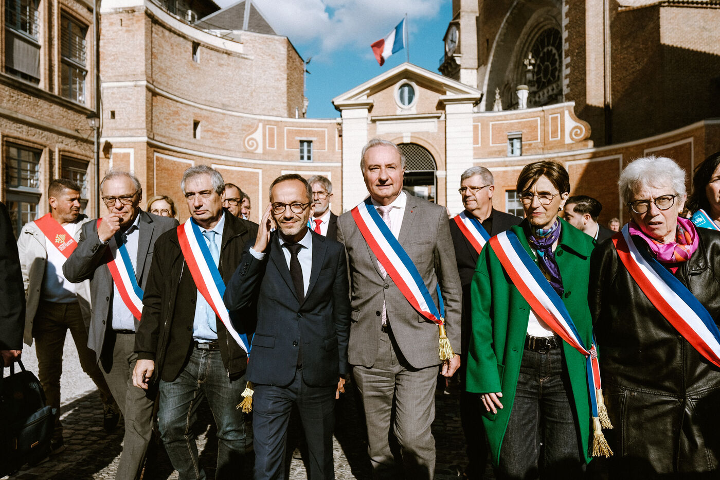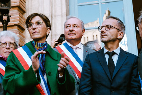 Demonstration of a hundred mayors in front of the prefecture against government budget cuts and loss of revenue for local authorities in Toulouse, southwest France on November 7, 2024.