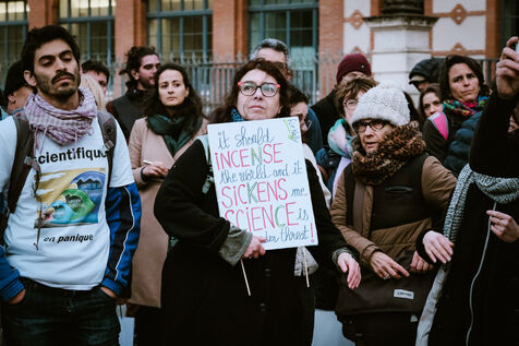 Rally of french scientists from the Stand Up For Science movement in solidarity with scientists in the United States who face the dismantling measures of the Donald Trump government in Toulouse, southwest France on March 7, 2025.