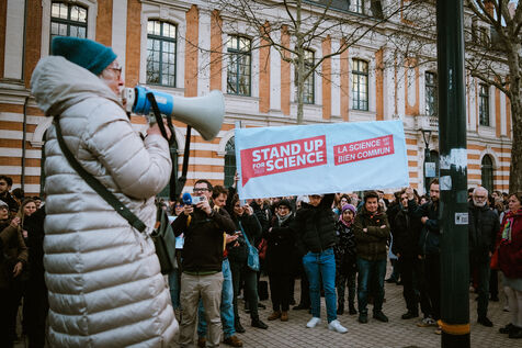 Rassemblement de scientifiques du mouvement Stand Up For Science en solidarité avec les scientifiques des Etats-Unis qui font face aux mesures de démantèlement du gouvernement de Donald Trump à Toulouse, sud-ouest de la France le 7 mars 2025.