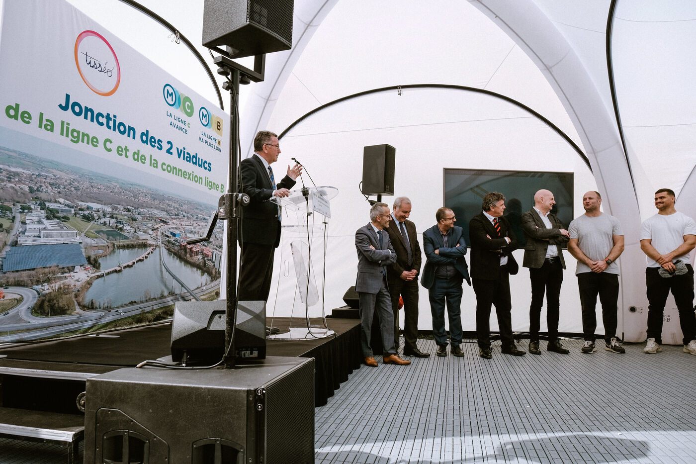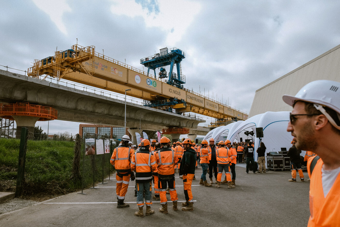 Inauguration de la jonction des viaducs des lignes B et C du métro dans la banlieu de Toulouse à Labège, sud-ouest de la France le 7 avril 2025.
