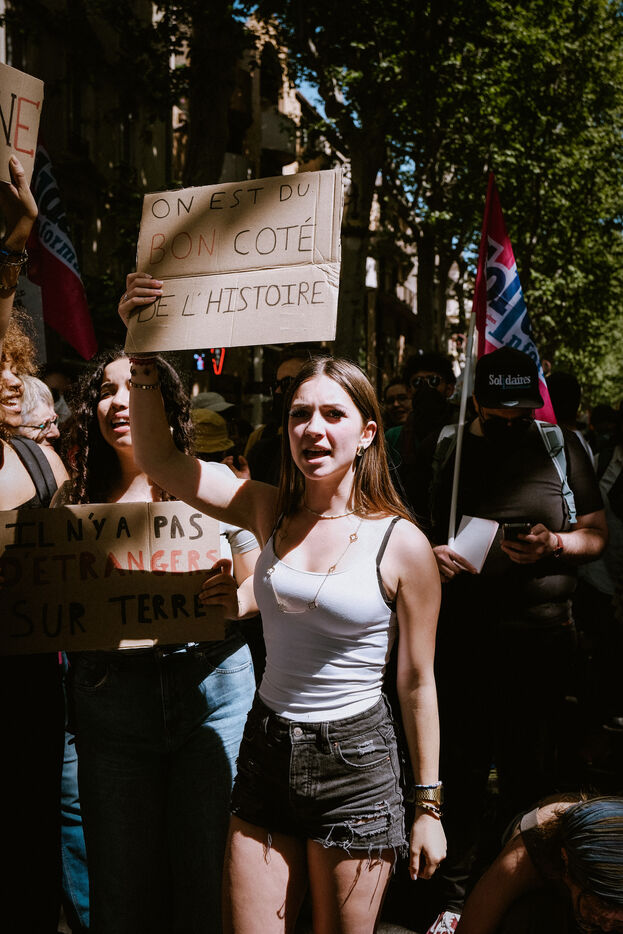 Manifestation syndicale pour la journée internationale de lutte pour les droits des travailleurs du 1er mai et contre l'extrême droite et le fascisme à Narbonne, sud de la France le 1er mai 2025.