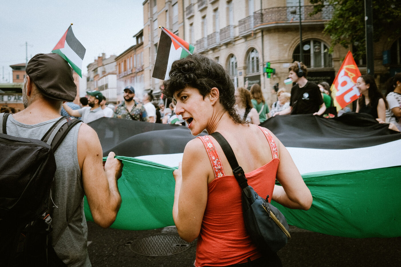 National demonstration called by trade unions (CGT, CFDT, Unsa, Solidaires and FSU) in support of the Palestinian people for an immediate ceasefire in Gaza and for access to humanitarian aid in Toulouse, southwest France on June 14, 2025.