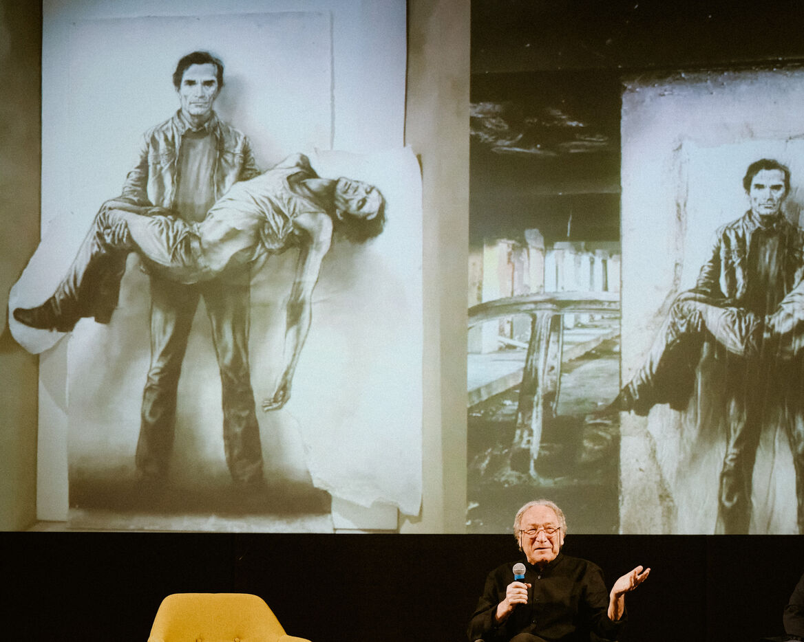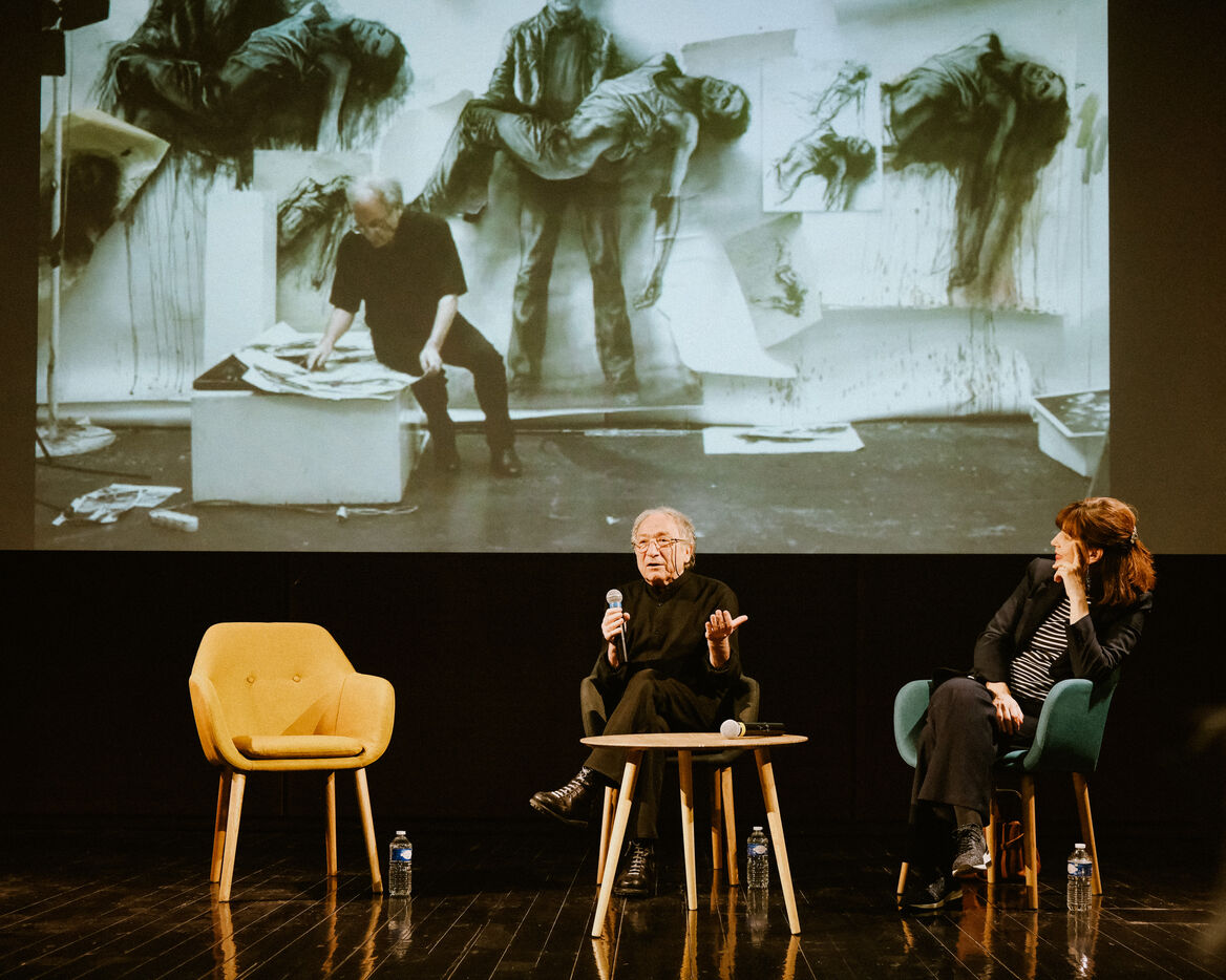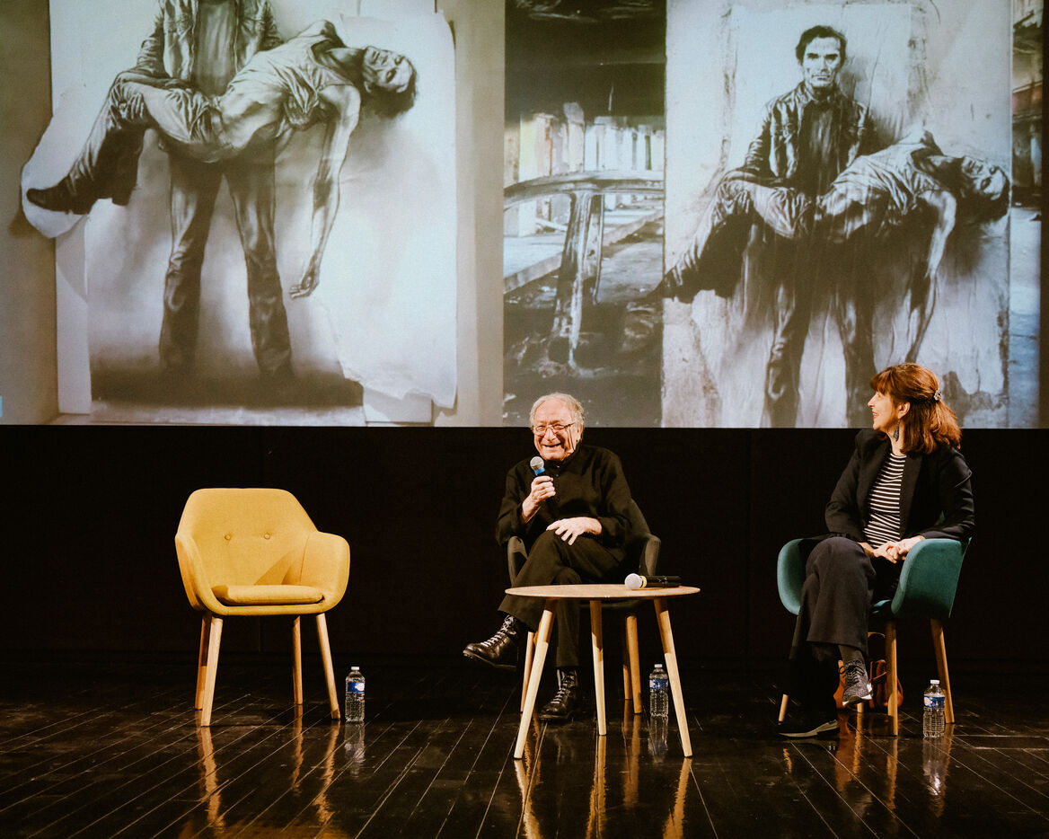 L'artiste plasticien de rue Ernest Pignon-Ernest lors d'une conférence autour de son œuvre à Toulouse, sud-ouest de la France le 10 avril 2025.