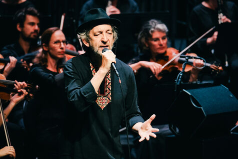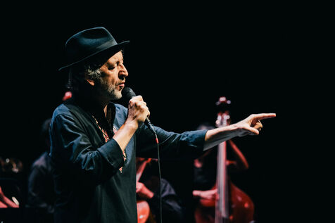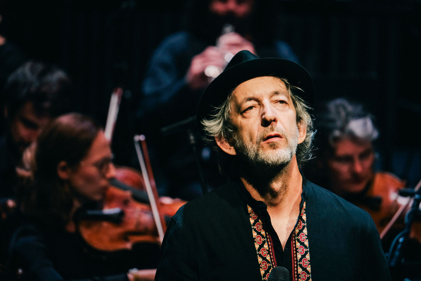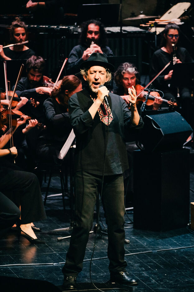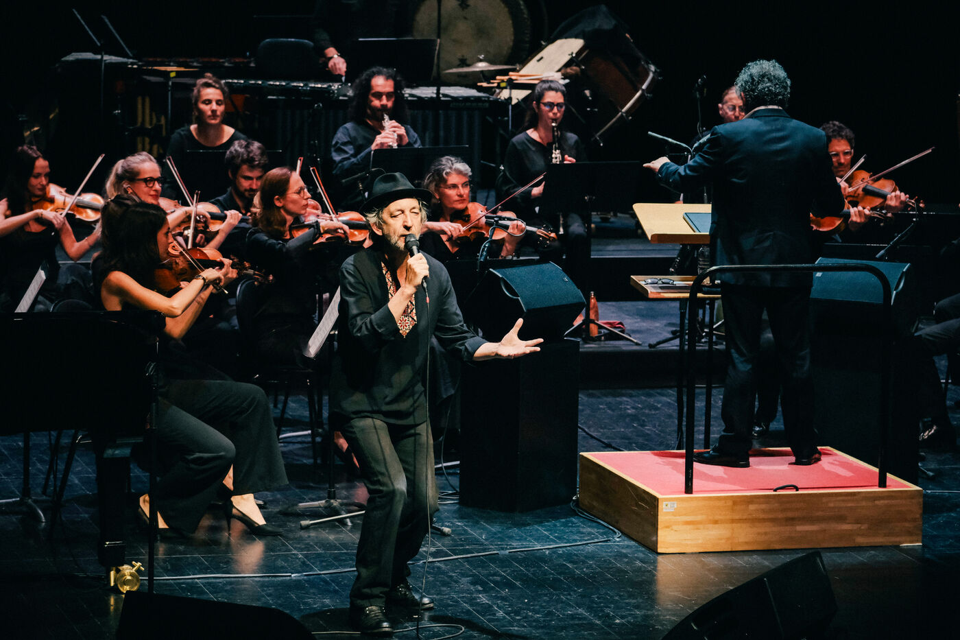 French singer Arthur H (Arthur Higelin) performs on stage with the Toulouse Chamber Orchestra symphony during the Toulouse Festival concert, southwestern France on July 11, 2025.