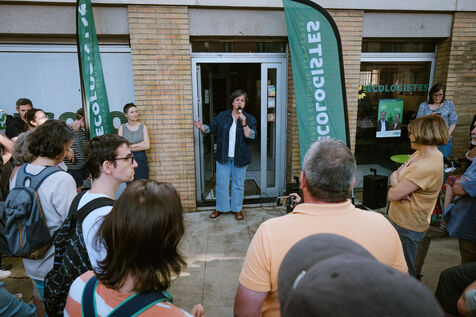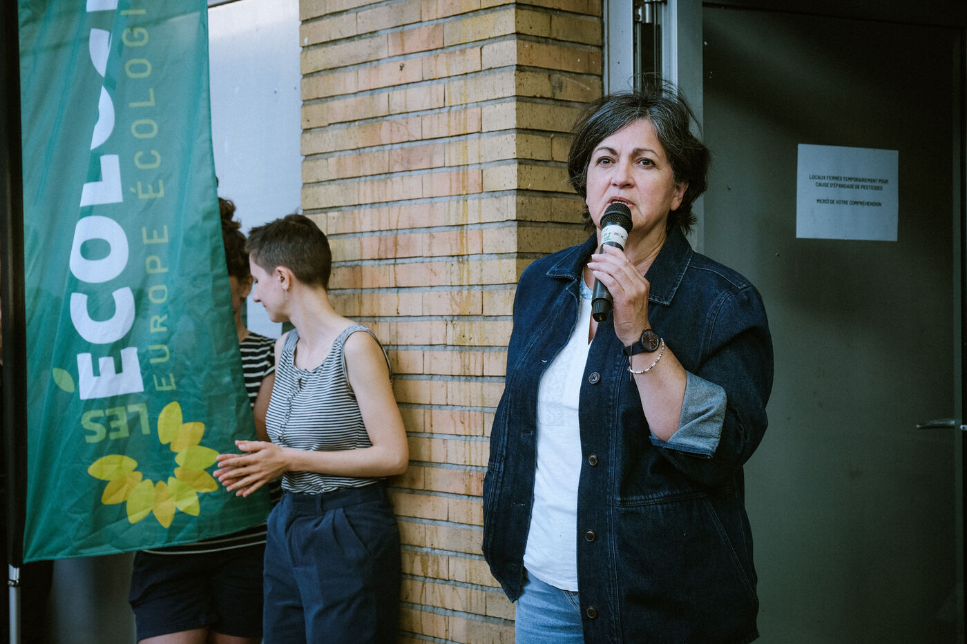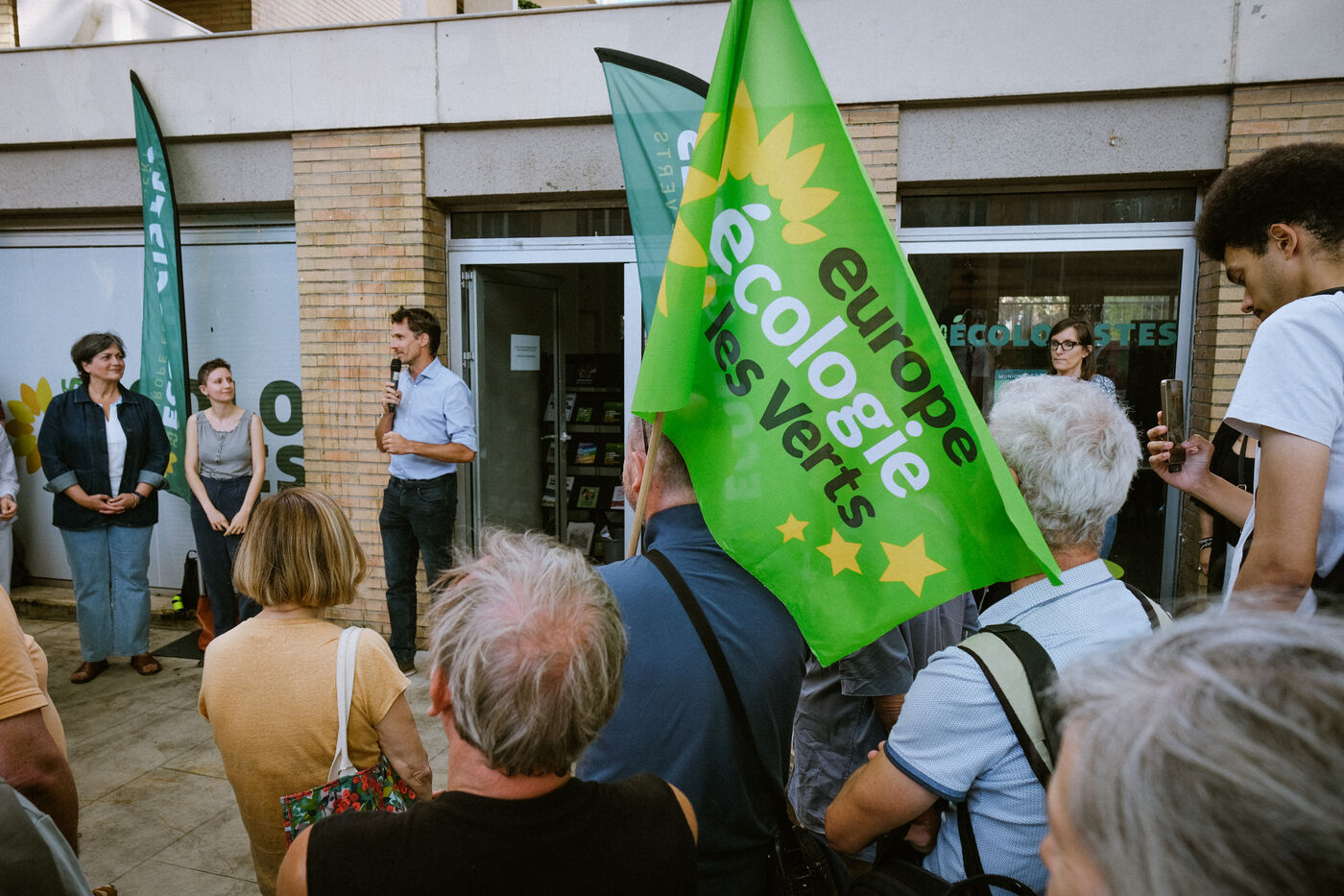 Rassemblement de soutien deux jours après la dégradation de la permanence du parti écologiste Europe Ecologie Les Verts (EELV) dans la nuit par des agriculteurs de la Coordination Rurale mécontents de l'opposition à la loi Duplomb à Toulouse, sud-ouest de la France le 24 juillet 2025.