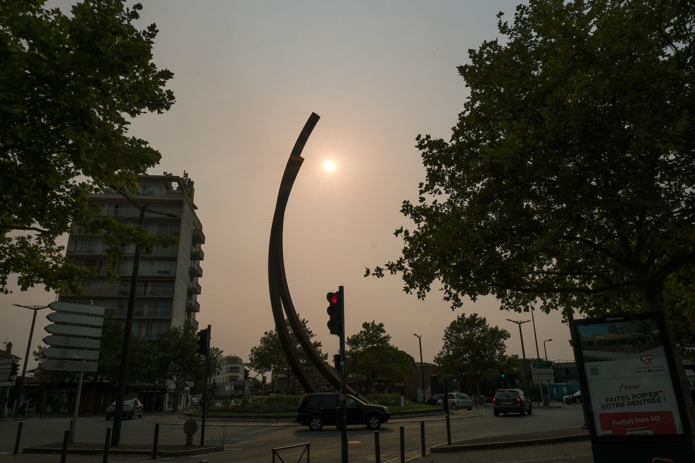 Les violents incendies qui ont lieu en Espagne et au Portugal teintent d'orange le ciel et le soleil de l'ouest de la France faisant penser à un coucher de soleil en plein après-midi à Toulouse, sud-ouest de la France le 17 août 2025.