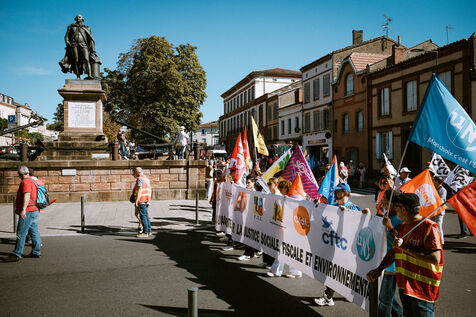 National demonstration organized by the main trade unions following the Prime Minister's refusal to take their demands into account for the next budget (increase in pensions, repeal of the pension law, introduction of the Zucman tax principle, etc.) in Albi, southwestern France, on October 2, 2025.